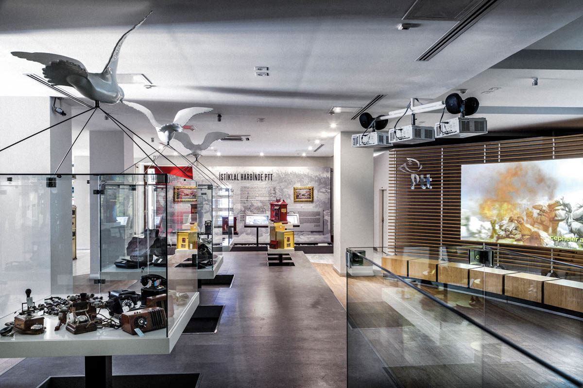 “İstiklal Harbinde PTT” kısmında ise, yüksek sesli sürekli dönen videoda okunan mektubun fazlaca zorlama bir duygusallıkta olması, arkadaki metinleri okumayı zorlaştırdığı gibi sergilenen nesnelerin algılanmasındaki konsantrasyonu güçleştiriyor. Yine de bu noktada ilginç bir kurgu söz konusu. Teknolojik kioskların taşlar arasından çıkması hiç karşılaşmayı düşünmediğim ilginç bir eşleştirme. Doğal bir malzemenin insan ürünü teknoloji ile birlikteliği diyebiliriz. Zemin katın orta alanı, bir parantez içerisine alınmışçasına kavisli formdaki iki seperatörün arasında tanımlanıyor. Seperatörlerin bu formu ziyaretçiyi sarıp sarmalıyor. Ünitelerdeki interaktif dijital ekranlar, konsantrasyonun azalma noktasında devreye giriyor ve ilgiyi canlı tutuyor. Zemin yükseklik farkları ve bu alanlarda kullanılan farklı malzemelerle sergileme bölümleri netleştiriliyor. Yapının kolonları ile doğal bir şekilde alan tanımı netleşen bu bölümde haberleşme ekipmanları sergileniyor. Sergileme ünitelerinin posta güvercini metaforu ile taşınıyormuş gibi kurgulanması keyifli bir espri katıyor.