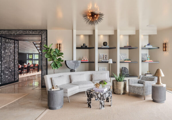 Dekorasyon çalışmaları Mart 2021’de başladı ve tamamlanması üç ay sürdü,” diye anlatmaya başlıyor ve “Yaptığımız çalışmalarda ev içindeki mekanların boyutları çok fazla değiştirilmedi. Mutfak alanı açıktı ve o bölüm yeniden boyutlandırılarak kapatıldı. Üst katta bulunan master yatak odasına bir giyinme bölümü kurgulandı. İç mekanları büyütmek ve alanları ferah göstermek için bazı çözümler uygulandı. Yaşam alanında farklı iki oturma alanı yaratıldı. Bu sayede bu alanda aynı anda iki farklı grup bağımsız şekilde zaman geçirebiliyor. Giriş ve yaşam alanı kısmında bej tonlarında parlak bir boya kullanıldı. Akşam saatlerinde ışıkların yansıması ile bu alanda farklı bir derinlik ortaya çıkıyor. Galeri boşluğundaki ışıklık eskisine göre daha geçirgen bir hale getirilerek evin genelinde gündüz daha aydınlık ve ferah bir ortam oluşturuldu. İki alanda el boyaması ve farklı tekniklerle bizim ürettiğimiz iki farklı ayna kullanıldı. Böylece giriş ve yemek odasında ferah bir his ortaya çıktı,” diye bahsediyor.