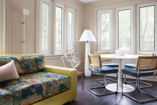 Oldukça yoğun doğal ışık alan bu oda için ev sahipleri çocukları için yaratıcılıklarını teşvik edecek bir alan tasarlamalarını istemişler. Çarpıcı renk ve desenlerden oluşan parlak bir koltuk zemini seçen tasarımcılar bu harekete eğlenceli bir yaklaşımla yan yana dizilmiş pembe pleksi sehpalar eklemişler. Odanın tek sakin kalan kısmı ise soluk pudra renk duvarları olmuş.