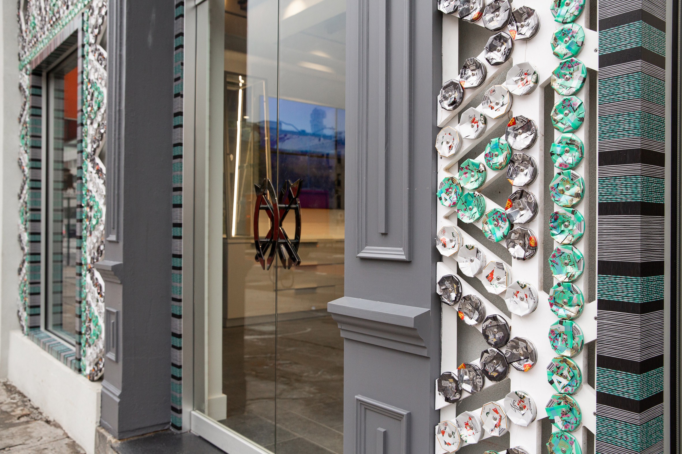 Stüdyo 4plus Design ekibinden Heather Faulding’in hem Hollanda hem de Afrika kültürüne ustaca referanslar kattığı mağaza oldukça ilginç bir görünüme sahip. Ezilmiş gibi görünen binlerce geri dönüştürülmüş beyaz, yeşil ve siyah içecek kutu; cepheyi dekore etmek için Arizona Iced Tea tarafından temin edilmiş. Kurucu ortak Osei bir Instagram gönderisinde, “Bu etkiyi yaratmak için, tümü manuel olarak kesilmiş, sıkıştırılmış, yapıştırılmış ve panellere vidalanmış toplam 13.500 ila 14.000 geri dönüştürülmüş kutu kullanıldığını tahmin ediyoruz” diyor. Kutular geleneksel Doğu ve Güney Afrika boncuk işçiliğini hatırlatması amaçlanan karmaşık bir kafes modelinde düzenlenmiş.