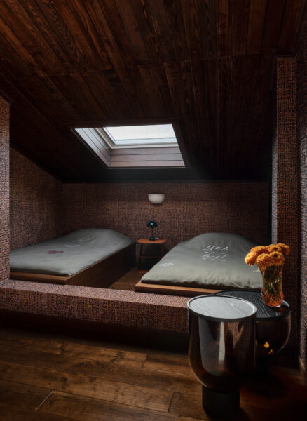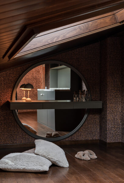 İkinci katın tümü ev sahibinin özel alanı olarak ayarlanmış. Ebeveyn yatak odası, oturma alanı, giyinme odası ve geniş banyo… Aliki Interiors tasarımı olan yatak başı, komodin ve ayak ucu pufu da bu alanda yerini bulmuş. Ebeveyn yatak odasının banyosundaki doğal dokular yine yalınlık ve sakinlikle bütünleşiyor.