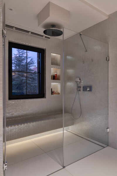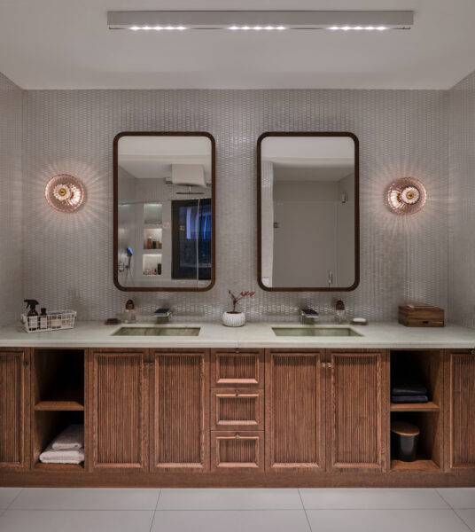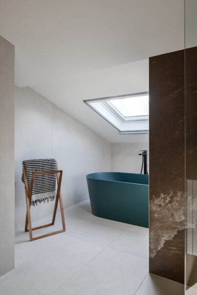 Evin tüm ıslak hacimleri bağlantılı olduğu mekanın stiline göre kurgulanmış. Evin girişinde konumlanan misafir tuvaleti cesur renk ve desen seçimleriyle oldukça davetkar bir yaklaşımdayken üst katlara çıkıldığında yatak odalarına hizmet eden diğer banyolar ise renk ve malzeme tercihleriyle daha dingin ve rahatlatıcı bir duruş sergiliyor.