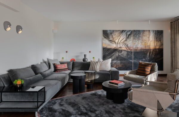 Salon duvarında Eva Nielsan’ın ‘Gama’ isimli tablosu sergilenirken, JAB Anstoetz marka kanepe ve koltuklarla uyumu yakalanmış, Diseno’dan alınan orta sehpalarla bütünlük sağlanmış.