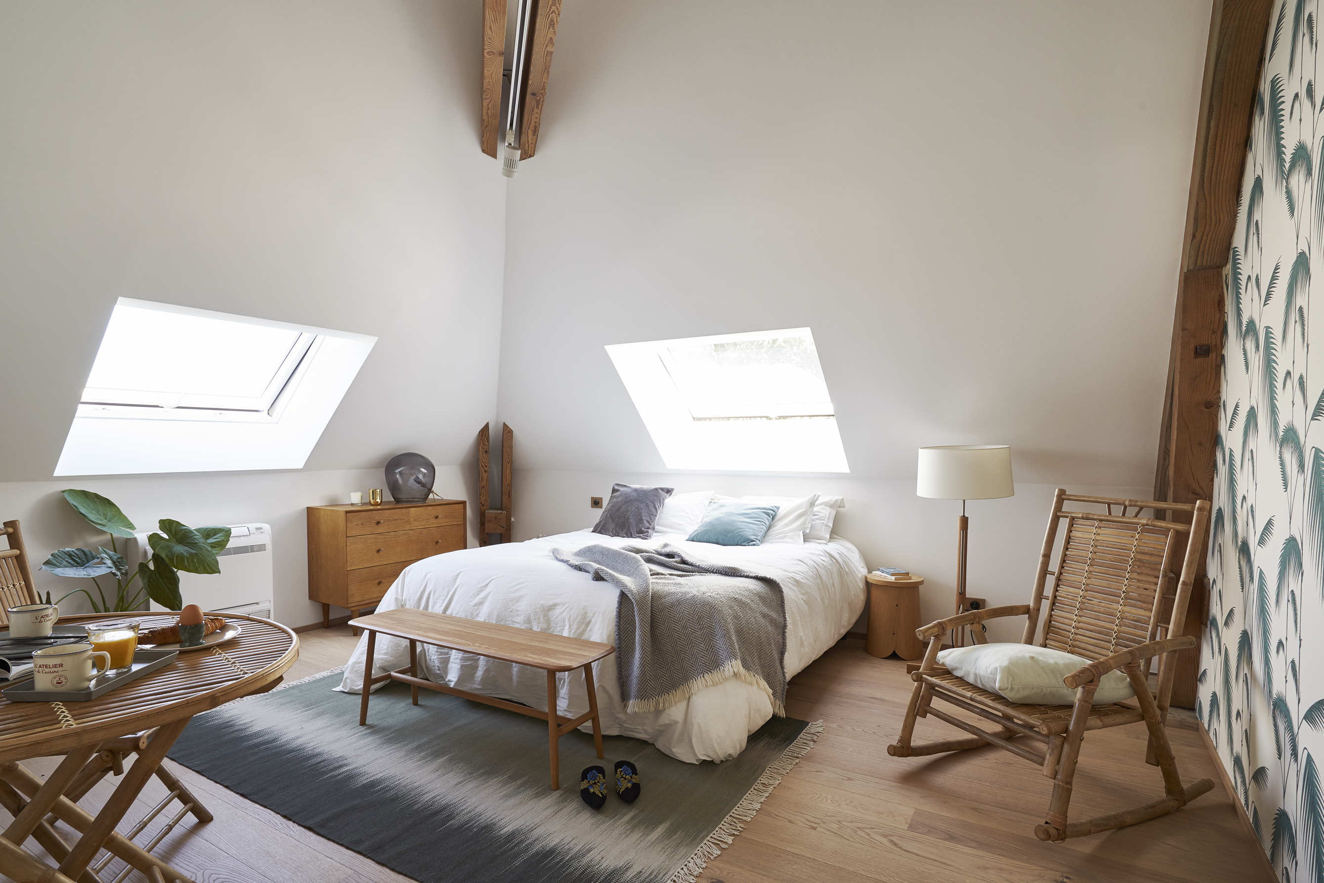 Misafir yatak odası ve spor salonunun yer aldığı en üst yani çatı katı renklerin nötüre alındığı bir alan. En alt kattaki koyu, ara kattaki orta tonlar burada iyice açılıyor. Tavandaki ahşap kiriş kullanımı yükseliğine vurgu yaparken doğal bir ortamın da sinyallerini veriyor. Çoklu kullanım alanı manzaranın ve hayatın keyfinin sürülebileceği fırsatlar sunuyor. Ev sahibi Michelle Lain, bu dönüşüm süreci için düşüncelerini “Tam olarak beni yansıtan bir ev ortaya çıkardılar” diyerek özetliyor.