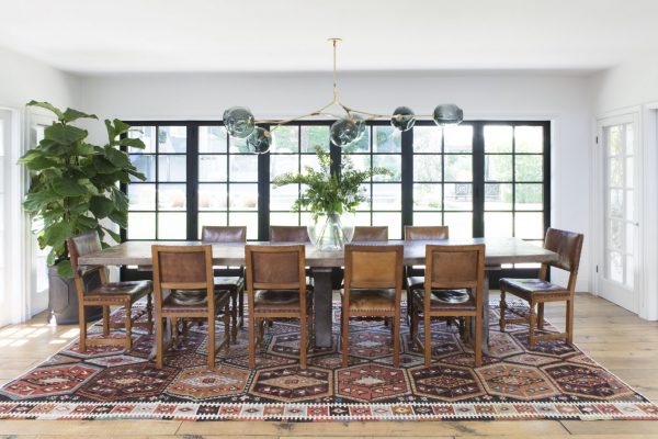 Oldukça geniş ebatlardaki yemek masası hemen altındaki etnik kilimle ayrı bir alan algısı yaratıyor. Deri sandalyeler de bu algıyı destekler nitelikte. Evin genelinde olduğu gibi burada da büyük objeler ve büyük aksesuarlar kullanılmış. Geniş alanda heykelsi formlar ortaya koyan bu kullanım, eve sakin ama güçlü bir tavır kazandırmış.