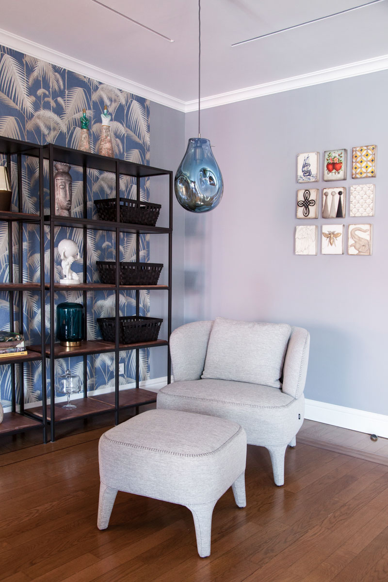 Evdeki en dikkat çekici noktalarından biri kuşkusuz Cole and Son markasından seçilen duvar kağıdı ile döşenmiş okuma alanı. Tekli koltuk arkasındaki duvardaki objeler, Aracı’nın yıllar önce Maison et objet Furarı’nda keşfettiği Sid Dickens markasına ait ve el yapımı. Bir diğer dikkat çekici duvar kağıdı ise ev sahiplerine hep güzel tatil hayalleri kurduracak Fornasetti’ye ait Yunan Evleri.