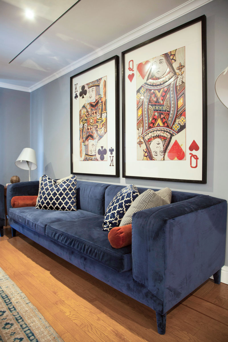 Genç ve dinamik ev sahipleriyle yolları kesişen tasarımcı, onlar için hayat tarzlarına uygun bir alan kurgulamakla başlamış işe. Ortak alanlarda demir ve pirince ağırlık vererek sportif kişiliklerini ortaya çıkartmış. Salondaki siyah TV paneli özel çizim, daha maskülen bir hava katmak için Pantone kataloğundan seçilen Stormy Weather rengi boyanmış metal paravanla birlikte kullanılmış. Oturma birimleri İtalyan tarzını yansıtmak amacıyla özel olarak üretilmiş. Gece mavisi koltuklar, ayaklara kadar kadife ile kaplanmış. Dörtlü sehpa için antik aynalar ve ithal mermer seçilmiş, ayaklarda ise mat metal tercih edilmiş.