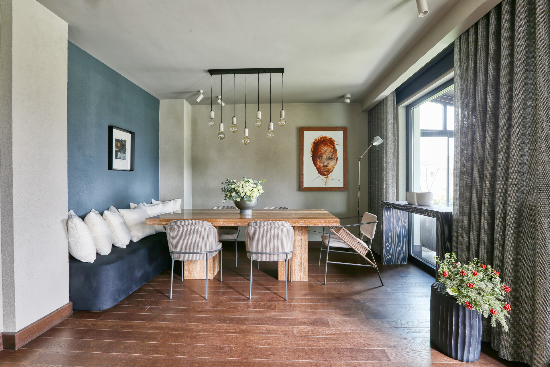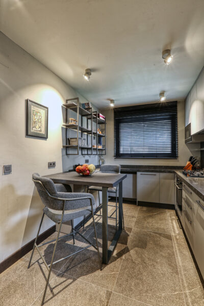 Yemek bölümündeki traverten masanın bir tarafında duvarla bütünleşen bir puf diğer tarafında ise Leta’dan alınmış farklı sandalyeler konumlanıyor. Bu bölümde oluşturulan asimetrik etki, sanat eserlerinin yerleşimi gibi ince detaylarda da kendisini gösteriyor.