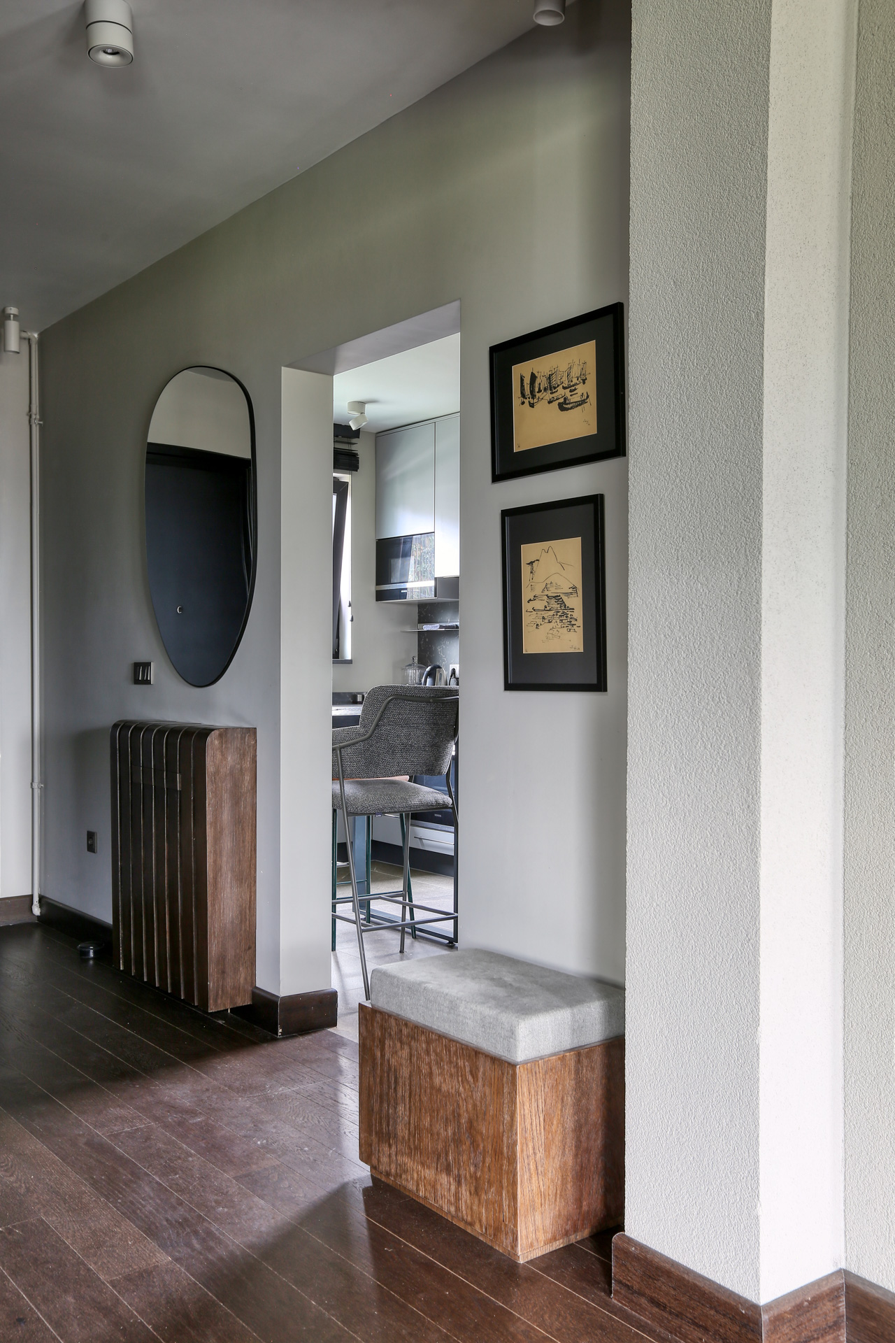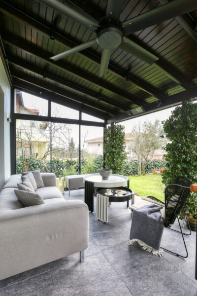Evin keyif köşelerinden bir diğeri de veranda da oluşturulmuş. Verandayı kış bahçesine çevirerek daha yarı açık ve sıcak bir oturma alanı yaratılırken geniş bir kanepe ile birlikte monokrom tonlarda sehpalar konumlandırılmış. Komple yenilenen mutfakta Lineadecor markası ile çalışılmış ve gri tonlarında mobilyalar tercih edilmiş. Mini bir yemek masası ve açık raf ile samimi bir tavır katılan mutfak pratik bir yemek hazırlığı ve atıştırmak için ideal bir ortam sunuyor. Girişte ise koyu renkteki parke zemine eşlik eden bir petek kaplaması yer alıyor. Hemen üzerine konumlandırılan ayna ile birlikte bir karşılama bölümü oluşturulmuş da diyebiliriz.