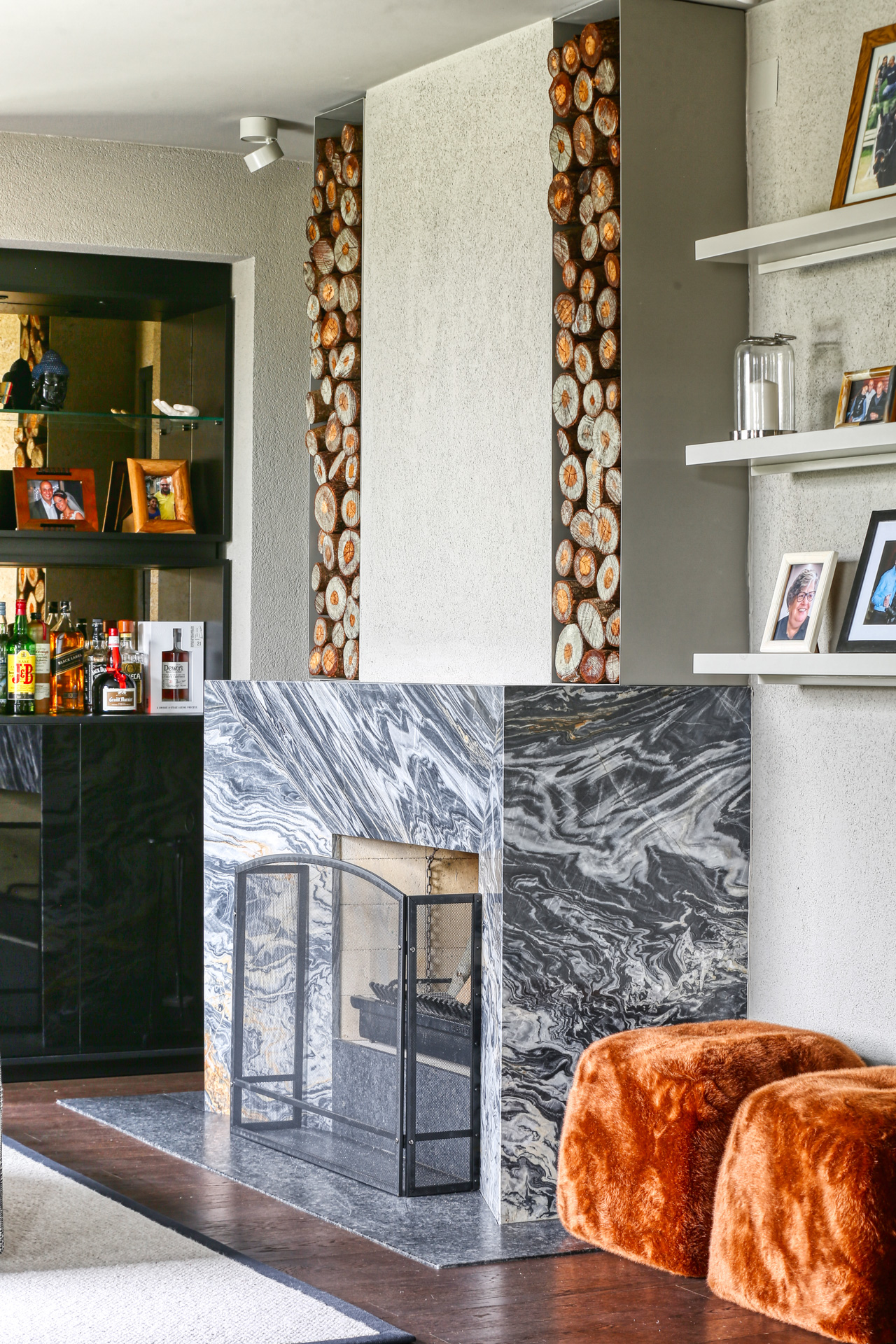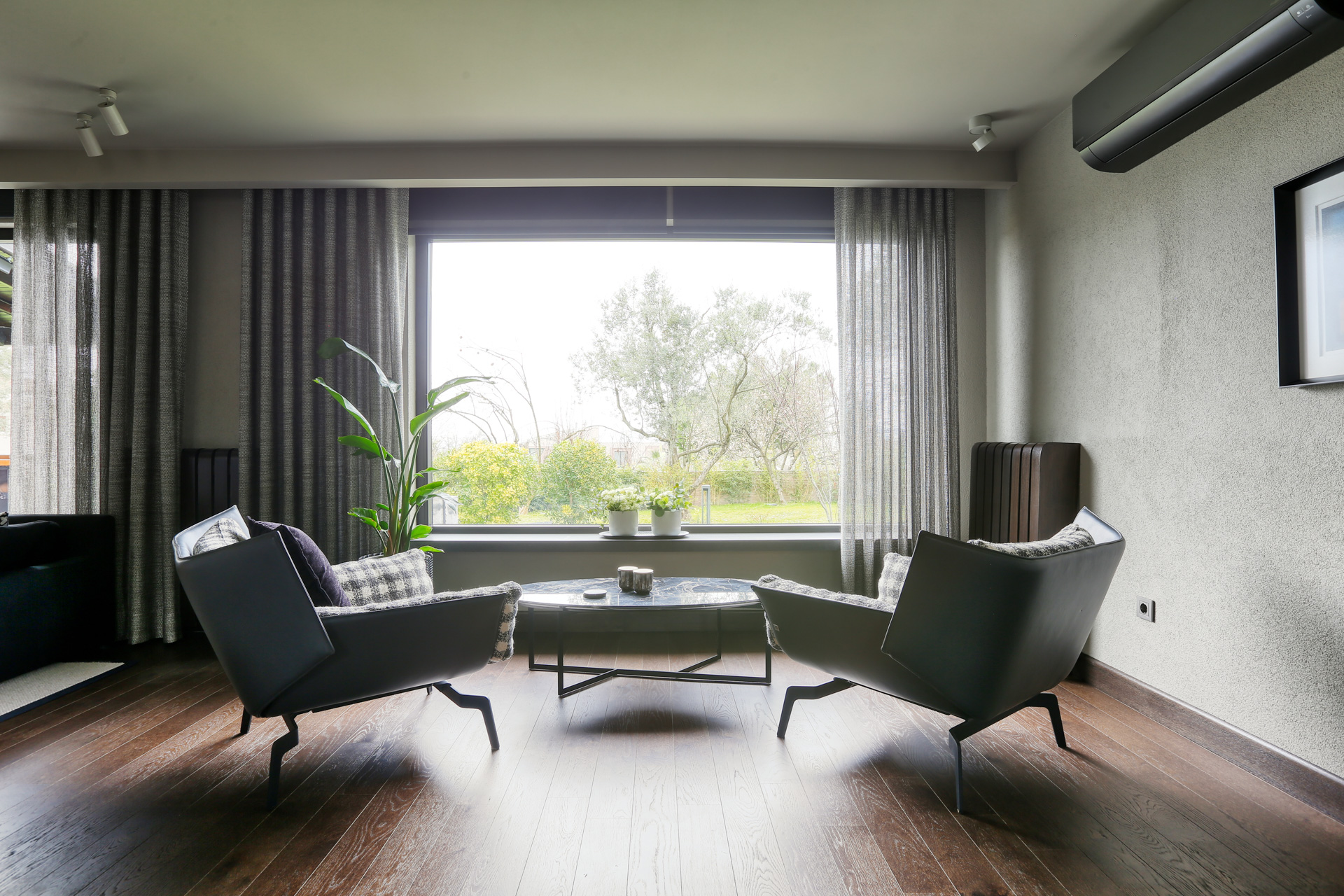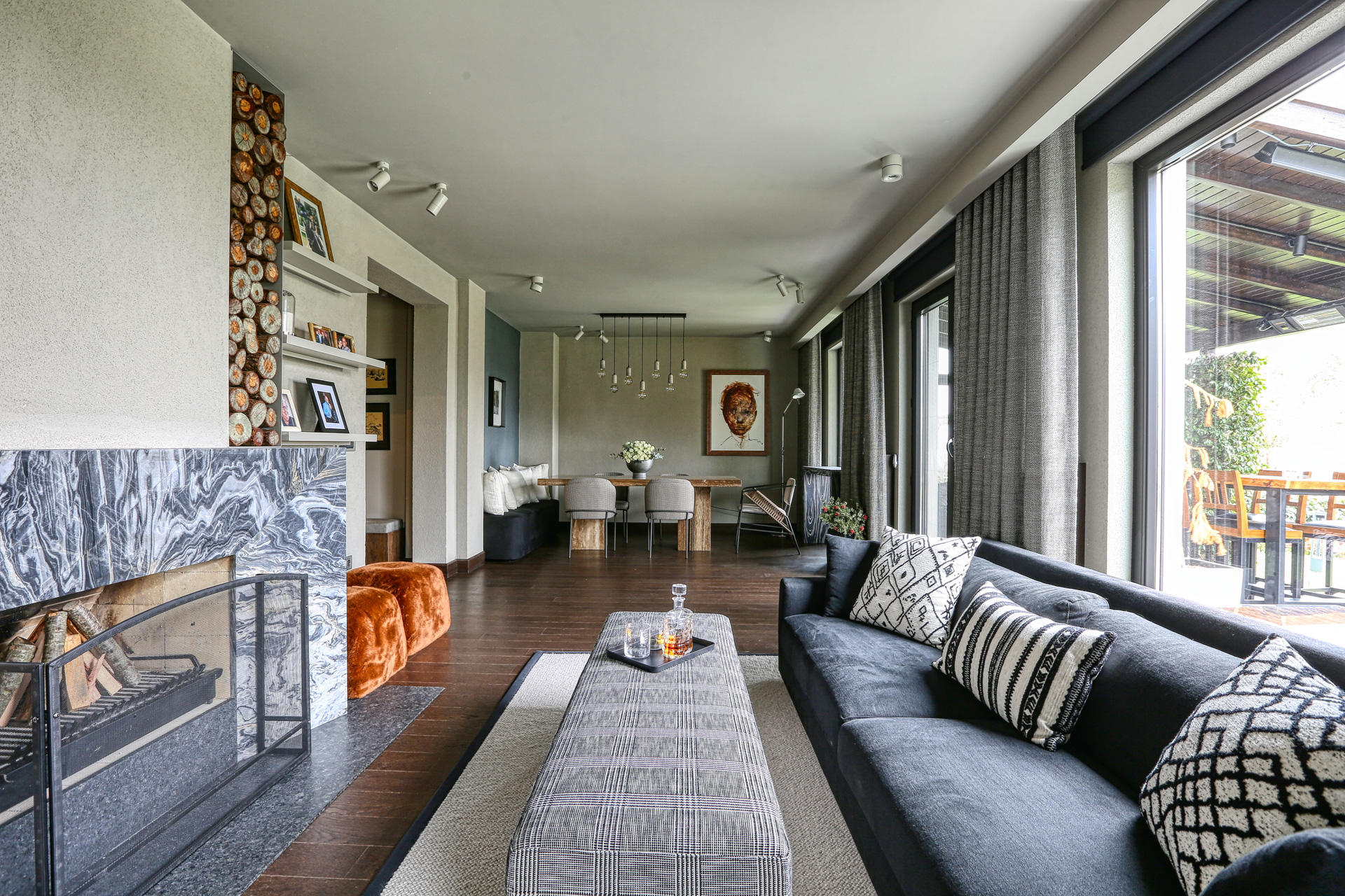Yalnız yaşayan ve evde vakit geçirmekten keyif alan ev sahibi için hem samimi bir alan hem de otel odası hissi verilmek istenmiş. Salonu farklı bölümlere ayıran Aliki Interiors ekibi, şömine önünde bir oturma ve yemek odası oluştururken bir de TV izlemek için alan yaratarak salonun ayrık yapısını kullanışlı hale getiriyor. Oldukça büyük olan şöminenin önünde geniş bir kanepe ile birlikte uzunca bir bench yer alıyor. Evin bahçesinin sunduğu yeşil ve huzurlu ortamı içeri taşımak istedikleri için mevcut doğramaları içeri almak ekibin alana getirdiği yapısal çözümlerden birisi. Bu etkinin hissedilebilir olması için Jab’tan alınan 2 loft tekli koltuk da manzaraya karşı yerini alıyor. Ergonomik ve konforlu bu koltuklar manzaranın keyfinin uzun süre çıkarılmasına yardımcı oluyor.