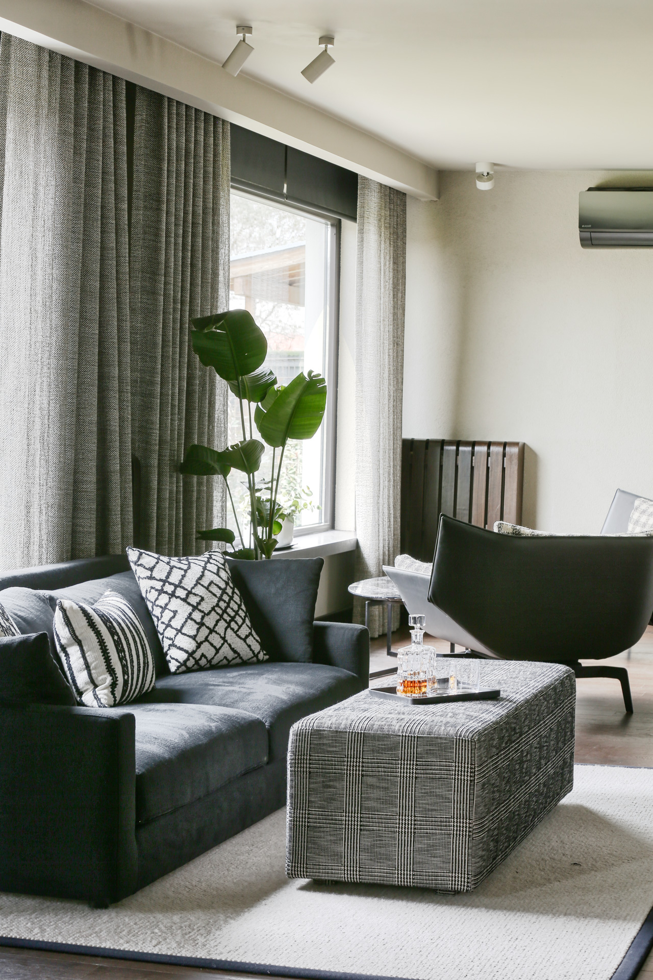 Tasarımlarında kumaş kullanmayı çok seven Aliki Kızıl’ın bu projesinde de kumaşlar önemli bir yer kaplıyoruz diyebiliriz. Ev sahibinin beğenisine uygun olarak grinin koyu tonlarında ilerleyen renk paleti kumaşlardaki farklı dokularla kademeli bir etki yaratıyor. Parke ve doğrama renklerindeki koyu tonlar da oluşturulmak istenen maskülen etkiyi devam ettiren unsurlar arasında.