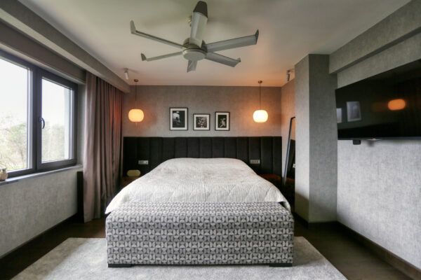 Yatak odasında ise istenen otel odası etkisi net bir şekilde hissediliyor. Duvar kağıtlarından halı seçimine, aydınlatmadan yatak başına her detay bir suitte kalıyormuşsunuz etkisini desteklemek için düşünülmüş.