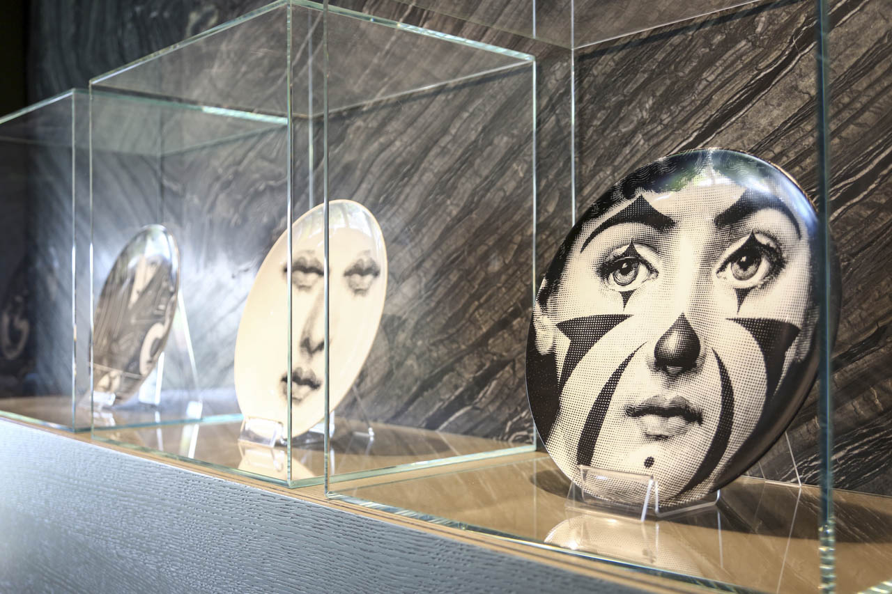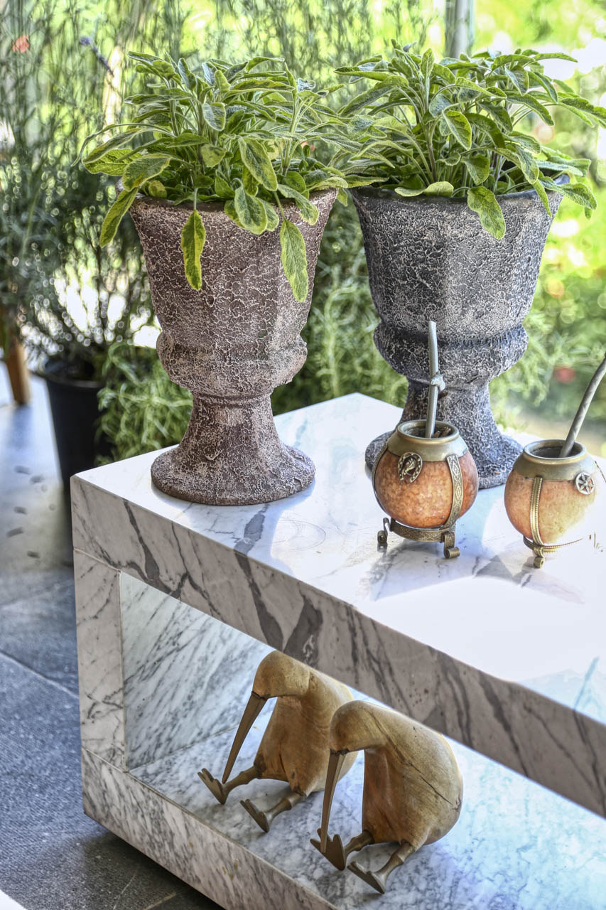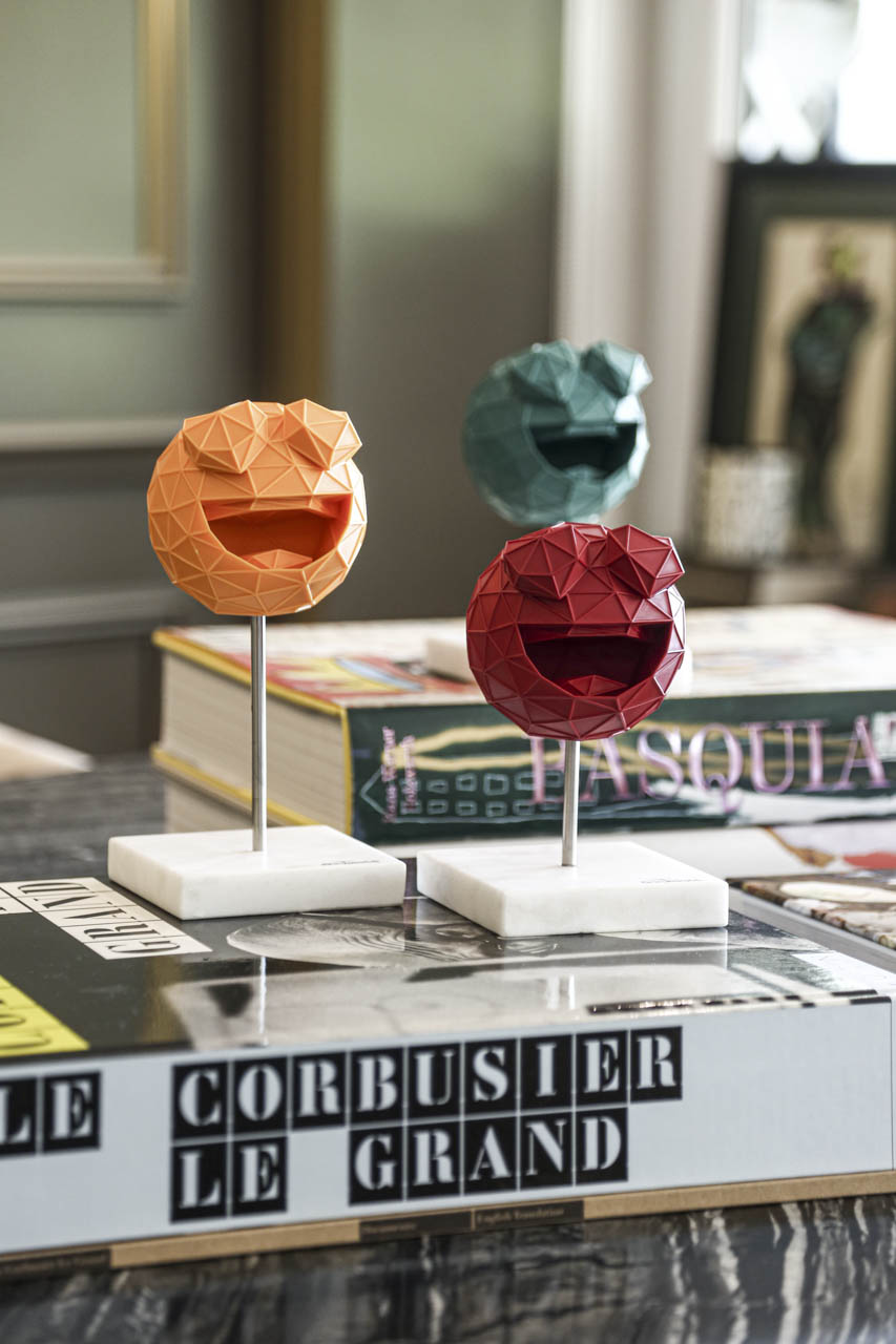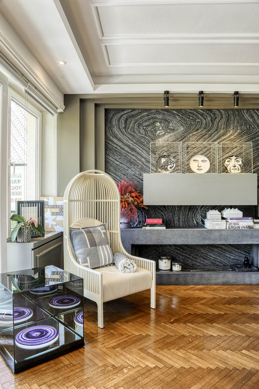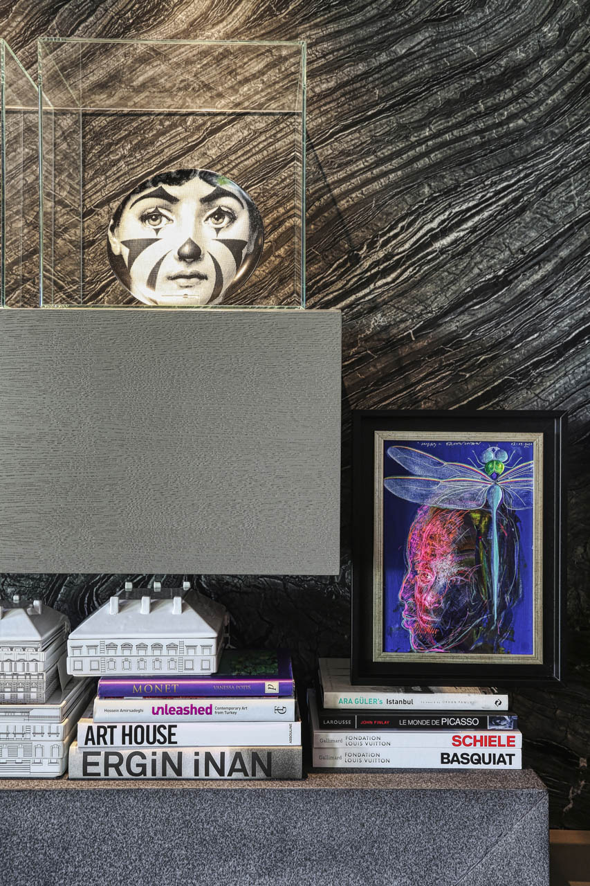Hem arkadaşları ile vakit geçirmeyi seven hem de kendine zaman ayırmak isteyen Hacıraifoğlu salonda arkadaşları ile yemek yiyip sohbet edebileceği bir yemek masası yerleşimi yapıyor. Dostlarla birlikte geçirdiği vakti daha da keyifli kılmak adına manzaraya dönük bir konumlandırma yapılıyor. Patine yüzeyli mermer masa kullanılan yemek bölümünde bolca sanat eseri kullanımı da dikkat çekiyor. Annesi ressam olan ve kendisi de sanata büyük ilgi duyan tasarımcının evinin hemen her köşesinde sanat eseri kullanımı göze çarpıyor. Salonun L konumundan dolayı daha kuytuda kalan oturma bölümü bir mabet gibi kurgulanmış. Mermer bir TV ünitesi ve karşısında geniş oturum bir L koltuk tercih edilmiş. Cam tablalı sehpa, evdeki diğer pek çok şey gibi Laxmi özel tasarımı. Hemen köşedeki tekli koltuk ise Hacıraifoğlu’nun çalıştığı ilk firma olan Autoban’ın kurucu Ortağı Seyhan Özdemir’in hediyesi. Hemen yanındaki eser ise Emre Namyeter’e ait. Etanollü şöminenin de konumlandırıldığı bu bölümde Fornasetti tabaklar da sanat eseri gibi yerleştirilmiş.