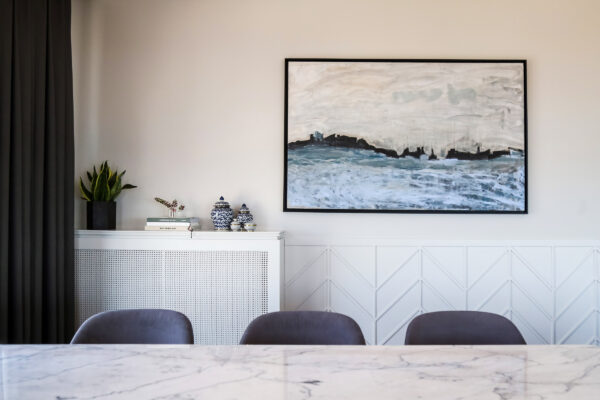 Manzarayı görünür kılmak hem ev sahipleri hem de Sos ekibi için önemli bir nokta. Bu nedenle televizyonun da bulunduğu bu cephe sade bir kurguya sahip. Ünitenin raflarında gri ve beyaz Canan Oktay imzalı seramikler kullanırken hemen yanında Birsen Canbaz imzalı mumluklar yer alıyor. Üzerindeki kırmızı tablo Serra Özbay’ın kendi koleksiyonundan, Marakeş seyahatinde aldığı, Faslı lokal bir ressamın işi. Rafta duran geometrik şekilli ayna Müz mağazasından.