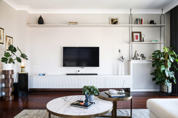 Hala genç, heyecanlı ve ne istediğini çok iyi bilen Sos Interior ile çalışmak isteyen ev sahibinin ilk beklentisi, evindeki mobilyalar çok tekdüze olduğu için ruh katmak ve kendi stilini eve yansıtmak istemesiymiş. Ev sahibi ve yaşam alanı arasındaki ilişkiyi güçlendirmeyi hedefledikleri bu projede Sos ekibi, mevcut mobilyaların bazılarını muhafaza ederken bazılarını dönüştürmüşler. Ve tabii ki proje için özel parçalar tasarlayıp atölyelerinde ürettirmişler. Gün ışığını olabildiğince içeride tutmak için genel olarak açık renkler kullanılmış. Ev sahibi evde yeşili, bitki görmeyi çok sevdiği için hem kendi bitkilerini hem de bazı ilaveler yapılarak plana dahil edilmiş. TV cephesi için tasarlanan ünite atölyede özel olarak üretilen parçalardan bir tanesi. Bütünsel bir tasarıma ulaşmak adına burada herhangi bir vurgu yapmaktan kaçınarak, TV ünitesinin duvar rengiyle aynı renk olmasına özen gösterilmiş ve hareket katmak adına pirinç ve metal detaylar kullanılmış.
