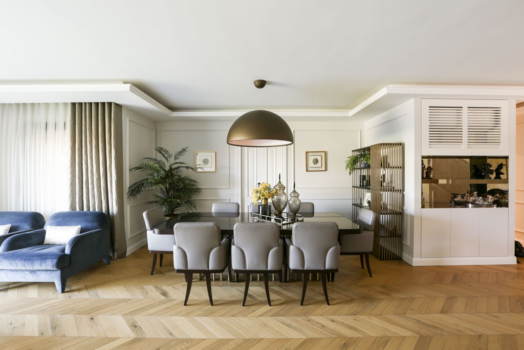 Çift kanatlı kapılarla mutfağa açılan yemek bölümünde şıklık ile birlikte fonksiyonellik de ön plana çıkıyor. Ralph Lauren’den alınan mobilyalar bu bölüme sade ve oldukça elegan bir görünüm katıyor. Koyu kahve üzeri cam, pirinç ayaklı vizon rengi sandalyeler ve pirinç profil gövdeli vitrin ile şekillenen alanda masa üzerindeki flos sarkıt aydınlatma Marcel Wanders’a ait Skygarden, mimarın severek kullandığı tasarımlardan biri. Dışı kahverengi, içi bir bahçeyi andıran aydınlatma ışıkla birlikte gizemli bir görünüm yaratıyor.