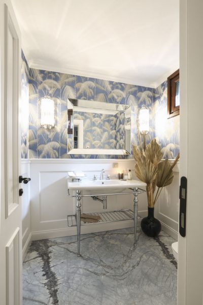 En alt katta misafir tuvaletinin duvarlarında Cole and Son markasından alınan Palm Jungle duvar kağıdı ve onunla uyumlu Iceberg mermer kullanımı göze çarpıyor. Mimarın da favorisi olan bu görünüm duvarda lambri döşemeler ve Altay Seramik’ten alınan Oxford metal ayaklı lavabo ve Phare Design’dan tercih edilen apliklerle final görüntüsüne kavuşuyor.