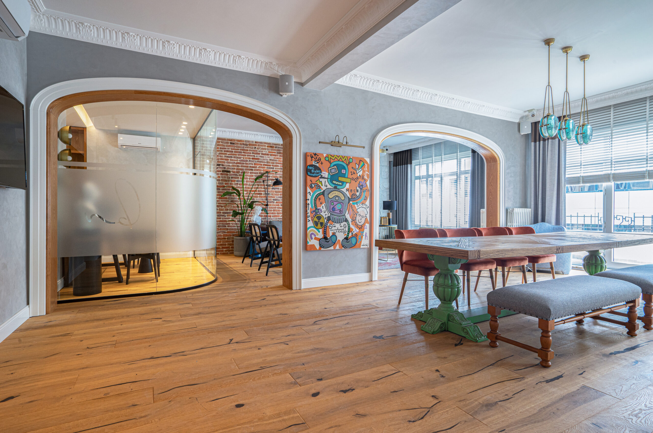 Burası bitişik nizam ve yüksek tavandan oluşan 2 katlı bir daire. Her dairenin kendisine ait ayrı bir girişi var ve toplamda 500 m2’lik kullanım alanına sahip. Tasarıma başlamadan önce kesin kararlı olduğumuz bir konu vardı, diyor Akyıldız. Nişantaşı dokusuna uygun bir tasarımı, modern hatlar ile bir araya getirme hedefi ile yola çıkıyorlar ve sonuç istedikleri gibi oluyor.