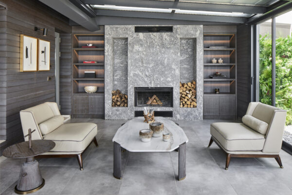 Kış bahçesi şömine Hürsan’dan. Koyu meşe duvar lambrisi, şömine yanı nişler, orta sehpa ayakları ve yan sehpa Legno Dekor’a yaptırılmış. Soldaki tablolar Feyza Ketenci’ye ait. Tablo apliği Light2Design’dan, deri koltuklar Sıt Design’dan seçilmiş.