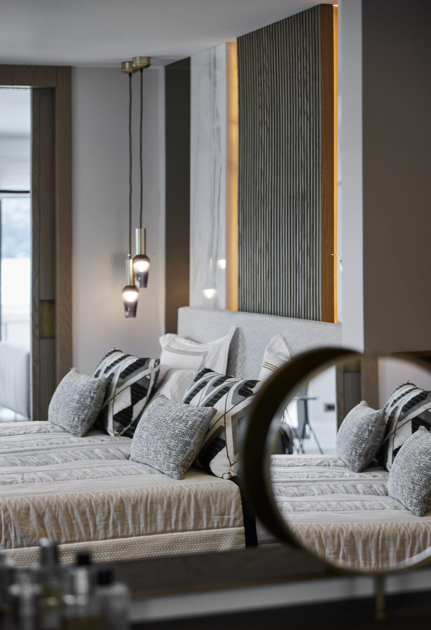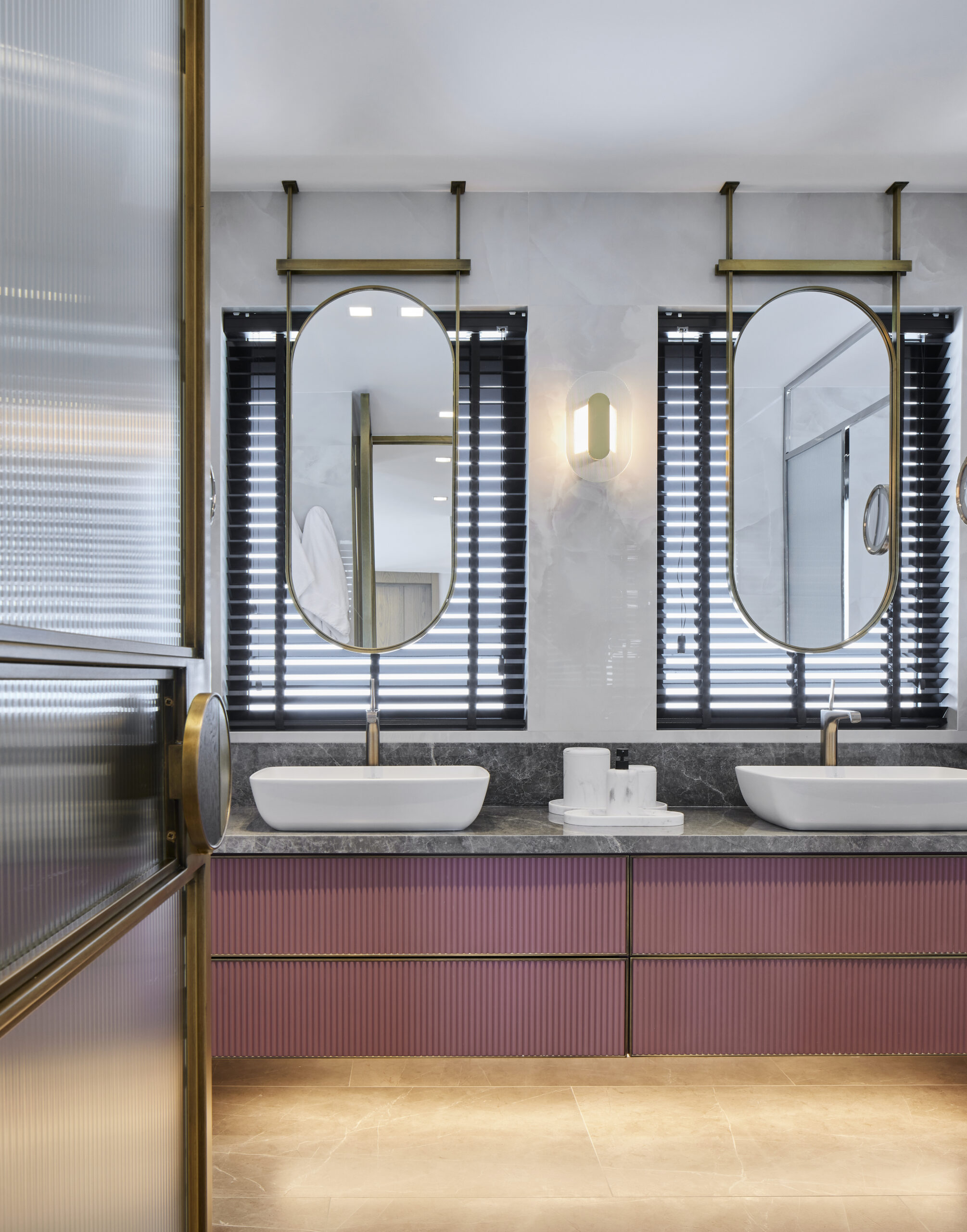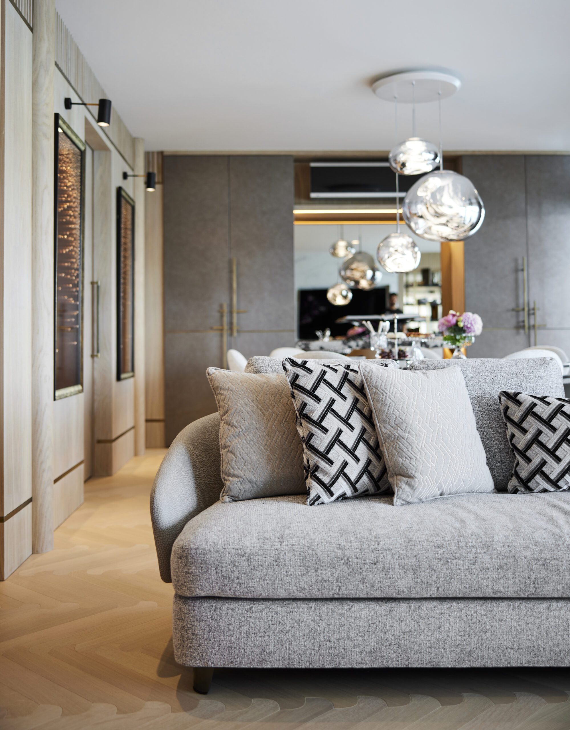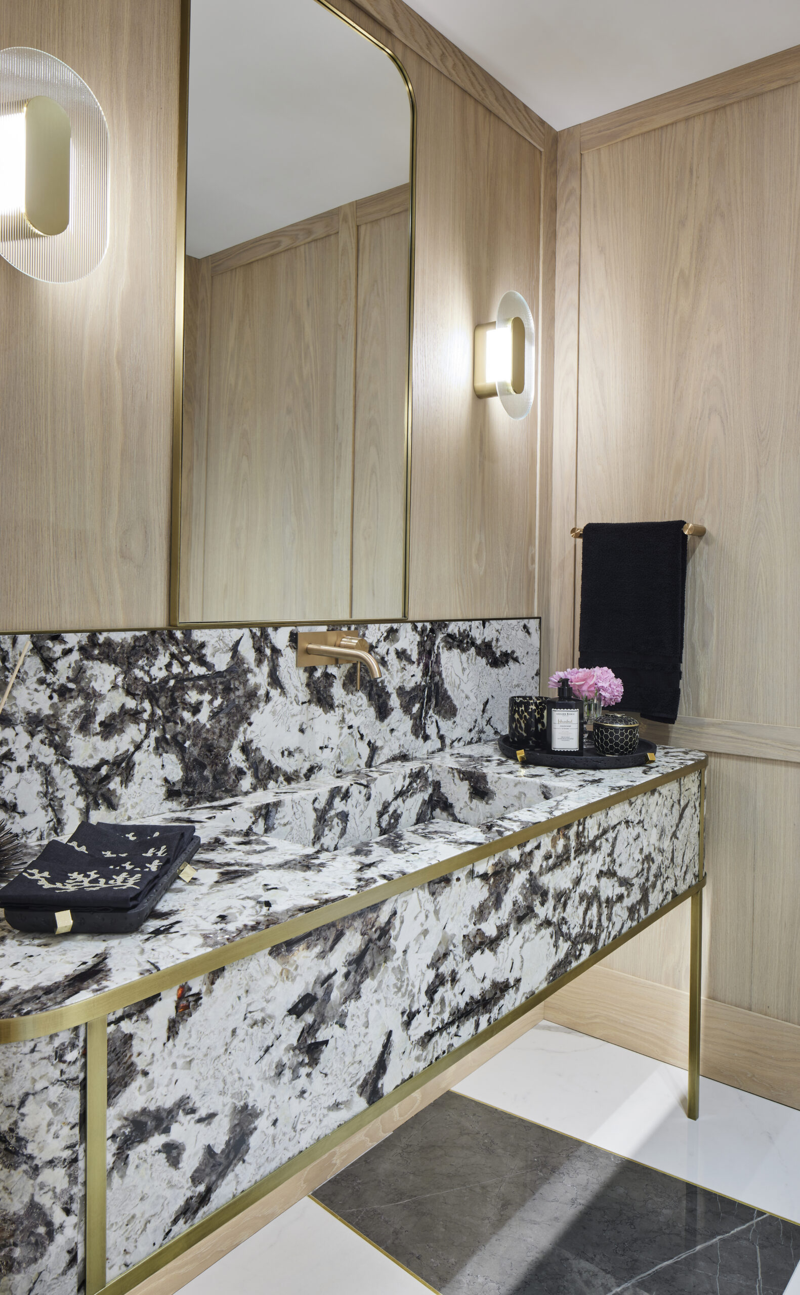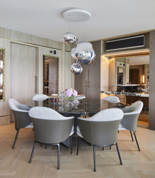 Çalışmaları Ocak 2020’de başlanan evin tadilat süreci on ay sürdü. Tadilat üzeri dekorasyon işleri derken evde yaşam Aralık 2021’de başladı,“ diye anlatmaya başlıyor ve “Eve ilk girildiğinde baya tadilat isteyen bir durumdaydı. Komple sökülüp müşteri talebine göre yeniden planlama yapıldı. Salondaki yemek bölümünün konumlanmasına göre mutfağa açılan ikinci bir kapı sürgü ile çözümlendi. Antredeki bölücü duvarlar kaldırılarak yerini bronz separasyonlara bırakarak daha şeffaf bir geçiş sağlandı. Üst katta ise tüm bölücü duvarlar kaldırılarak yeni bir suit haline getirildi. Teras alanında ise bir kısım keyifli kış günlerini Boğaz manzarası eşliğinde geçirebilmek adına kış bahçesi haline getirildi. Şömine eklenerek daha da keyifli bir mekan yaratılmak istendi. Evin iç mekanlarını büyütmek ve alanları ferah göstermek için şeffaf separasyonlar, bronz aynalar ve açık renk duvar ve zemin malzemeleri kullanılarak ferahlık sağlandı,” diye belirtiyor.