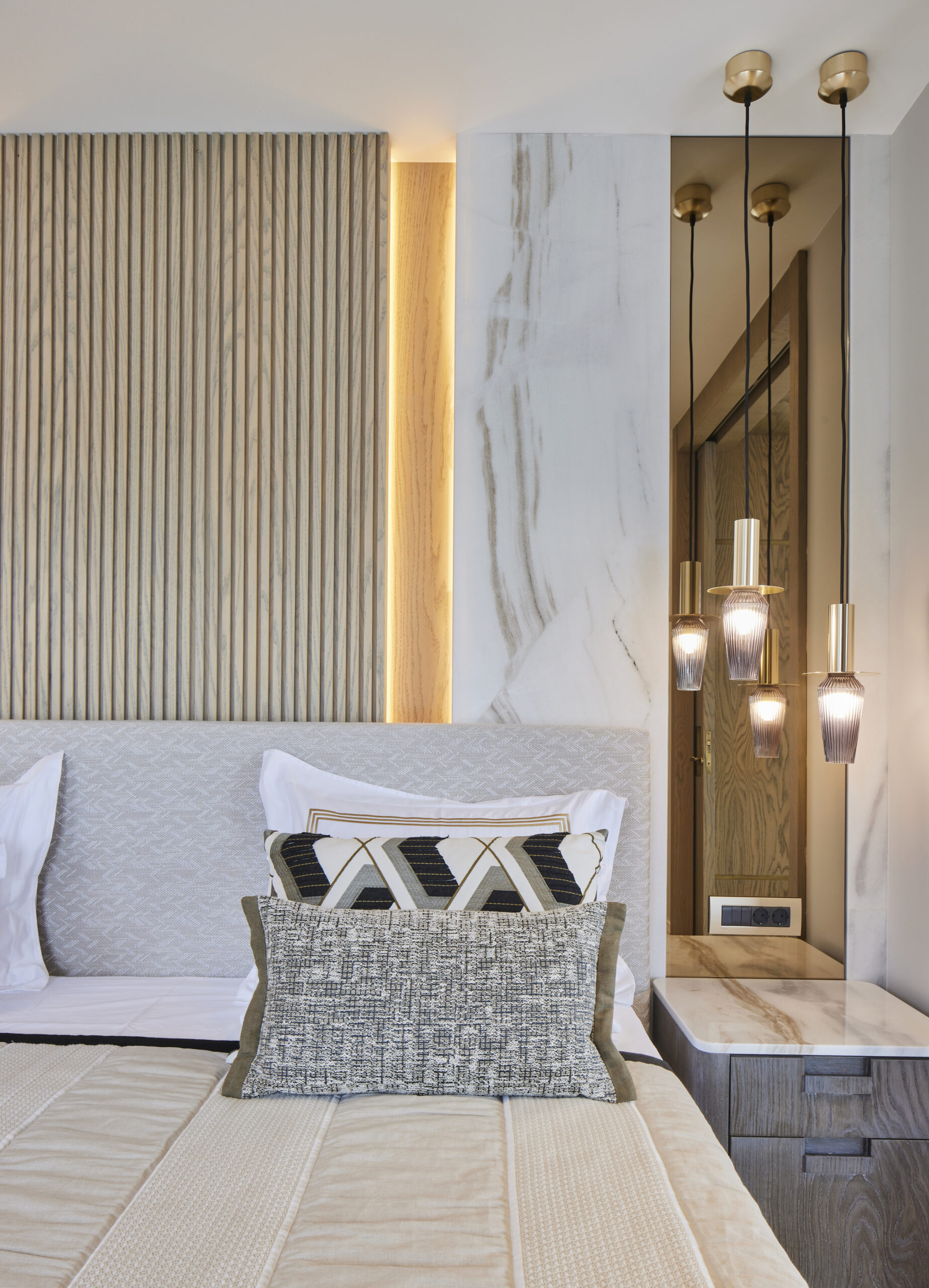 Evi gezerken 2022 Edida Yılın İç Mimarı ödülüne laik görülen iç mimar Esra Kazmirci bize detayları veriyor. “Ev sahipleri ile sosyal medya sayesinde tanışıp bir araya geldik. Artık günümüzde böyle teknolojik karşılaşmalar çok sık oluyor. Dubleks dairenin toplamı 280m2 ve aynı ebatta bir de teras alanı bulunuyor. Giriş katta salon ve yemek bölümü, gizli bir kapıyla mutfağa açılıyor. Katta banyolu iki çocuk odası, misafir tuvaleti ve çamaşırlık var. Üst katın merdiven çıkışında kitchenette, sağ kanatta ebeveyn suitine açılan kapıdan girince açık giyinme odası, ebeveyn banyosu ile yatak odası mevcut. Sol kanat ise ev sahibinin çalışma ve televizyon odası olarak değerlendirildi.
