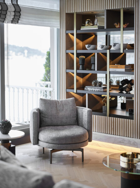 Boğaz manzaralı dubleks yalı dairesinde Esra Kazmirci Mimarlık imzasına rastlıyoruz. Dekorasyon, zamansız stilde modern ve sıcak dokunuşlarla oluşturulmuş.