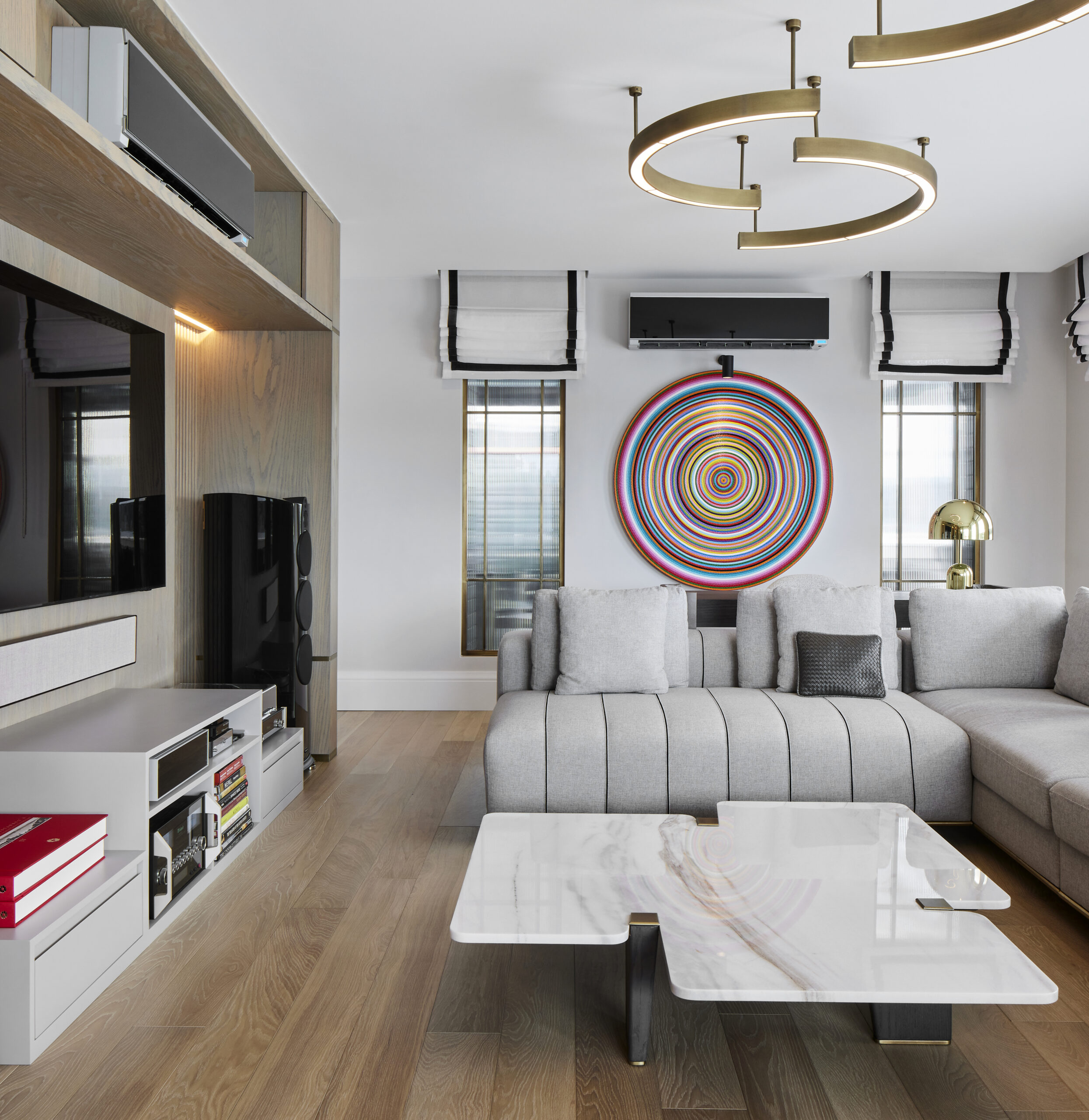 Çalışmaları Ocak 2020’de başlanan evin tadilat süreci on ay sürdü. Tadilat üzeri dekorasyon işleri derken evde yaşam Aralık 2021’de başladı,“ diye anlatmaya başlıyor ve “Eve ilk girildiğinde baya tadilat isteyen bir durumdaydı. Komple sökülüp müşteri talebine göre yeniden planlama yapıldı. Salondaki yemek bölümünün konumlanmasına göre mutfağa açılan ikinci bir kapı sürgü ile çözümlendi. Antredeki bölücü duvarlar kaldırılarak yerini bronz separasyonlara bırakarak daha şeffaf bir geçiş sağlandı. Üst katta ise tüm bölücü duvarlar kaldırılarak yeni bir suit haline getirildi. Teras alanında ise bir kısım keyifli kış günlerini Boğaz manzarası eşliğinde geçirebilmek adına kış bahçesi haline getirildi. Şömine eklenerek daha da keyifli bir mekan yaratılmak istendi. Evin iç mekanlarını büyütmek ve alanları ferah göstermek için şeffaf separasyonlar, bronz aynalar ve açık renk duvar ve zemin malzemeleri kullanılarak ferahlık sağlandı,” diye belirtiyor.