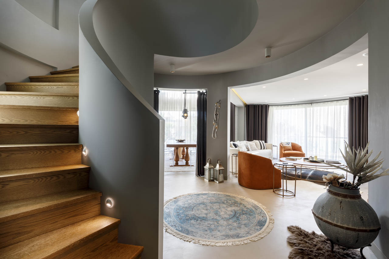 Günün farklı saatlerinde farklı etkinliklerde kullanılabilecek şekilde bir kurgu oluşturmak adına aydınlatma düzenlemesinde fonksiyonellik ön planda tutulmuş. Perde seçimlerinde kullanımı kolay, keten kumaşlar evin kavisli cephe detayına rağmen alışılmışın dışına çıkmadan, düz formlu olarak kullanılmış. Sadece galeri boşluğunda ev sahiplerine kolaylık sağlamak amacıyla motorlu sistem tercih edilmiş. Özellikle seçilen derzsiz ürünler pürüzsüz ve akıcı bir dokunun oluşmasını sağlamış. Mekanları daha ferah ve geniş göstermek amacıyla zeminlerde açık renk tonuna yönelinerek gün ışığı iç mekana taşınmış. Malzeme olarak ise tüm zeminlerde kullanılabilen ve son dönemlerde popülerliğini gittikçe arttıran mikro çimento uygulanmış.