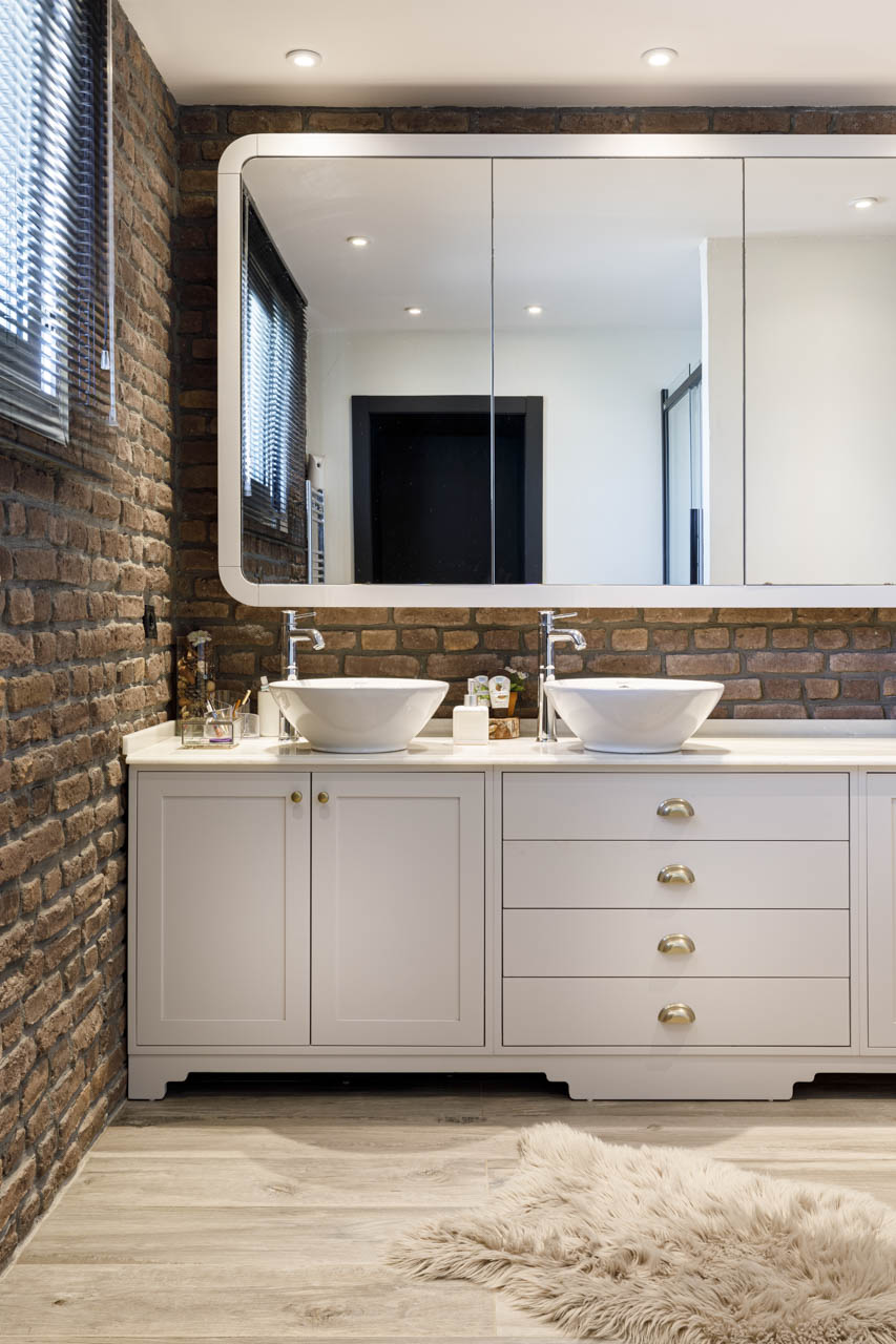 Evin geneline hakim endüstriyel tavrın oluşturulmasında galeri boşluğunun da etkisi büyük. Tavandan sarkan aydınlatmalar, devam eden taş duvar, küt ahşap raflar bir bütünü birleştiren önemli parçalar. Taş duvarların ve aydınlatmaların kattığı endüstriyel etki ahşap masa, keten koltuk seçimi gibi noktasal dokunuşlarla yumuşatılıyor ve dengeli bir görünüm sağlanıyor. Görünümü tamamlayan şeffaf sandalyeler Kartell, halı Mudo Concept.