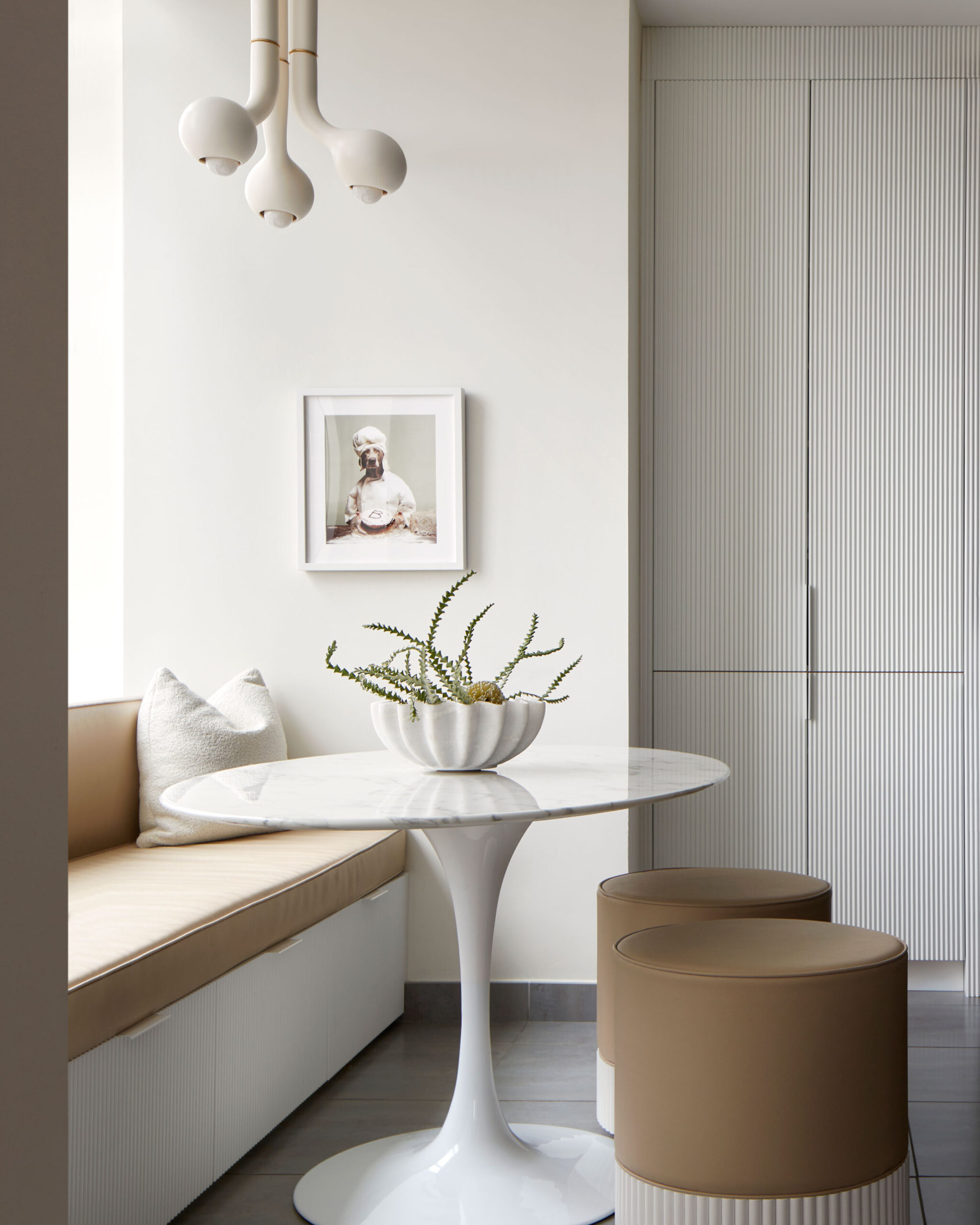 Aydınlatmalar da heykelimsi formları ile hem tavanda hem de yerde güçlü bir duruş sergiliyor. Her parça kendi içinde bir anlama sahipken bir araya geldiklerinde tek bir ifadeye bürünüyor.