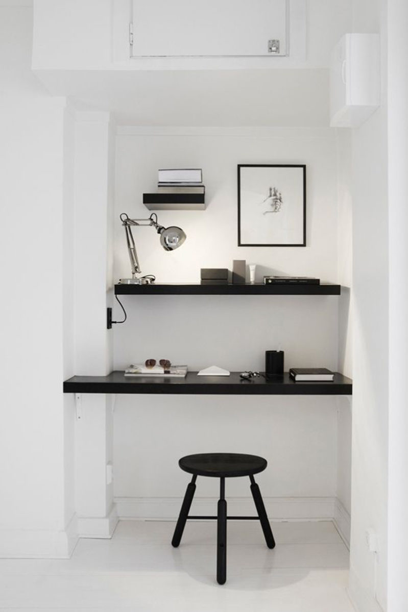 Mekanda niş gibi bir alanınız varsa, pratik ve yalın bir çözüm üretmek istiyorsanız işiniz çok kolay. Karşıdan baktığınızda duvara bir çizgi çekmiş gibi, biraz geniş ölçüde banko ve depolama için minik bir dolap ya da bir tane dar raf ile köşenizi tamamlayabilirsiniz.