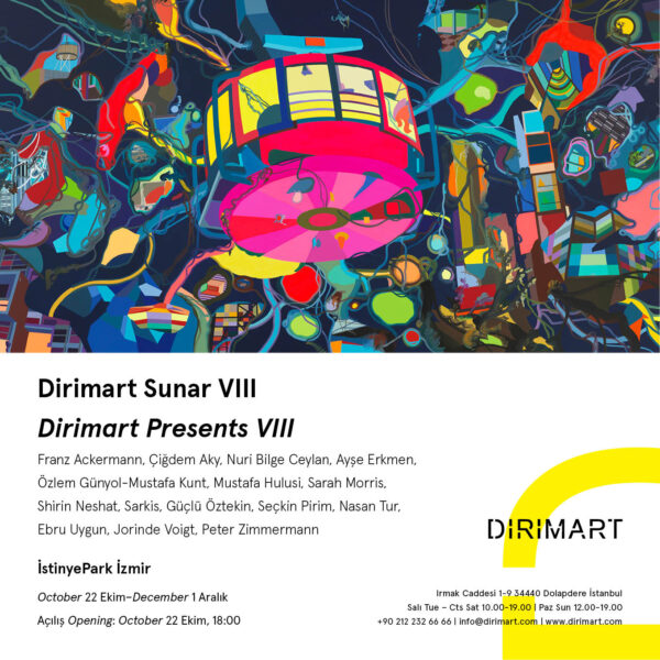 Dirimart’ın İstinyePark’taki mekânı, ilki 2009 yılında gerçekleştirilen Dirimart Sunar sergilerinin sekizincisiyle açılıyor. Dirimart Sunar VIII, galerinin temsil ettiği sanatçıların yapıtları arasındaki diyaloğu yansıtma fikrinden yola çıkan bir seçkiden meydana geliyor. Sergi, çalışmalarını Türkiye’de sürdüren Nuri Bilge Ceylan, Güçlü Öztekin, Seçkin Pirim, Ebru Uygun; çalışmalarını yurtdışında sürdüren Çiğdem Aky, Ayşe Erkmen, Özlem Günyol-Mustafa Kunt, Mustafa Hulusi, Sarkis, Nasan Tur ve ilk kez Dirimart’ın Türkiye’de izleyiciyle buluşturduğu Franz Ackermann, Sarah Morris, Shirin Neshat, Jorinde Voigt ve Peter Zimmermann’ın yapıtlarını bir araya getiriyor. Resimden heykele, desenden neona farklı mecralarda üretilen yapıtlar Dirimart’ın İzmir’deki mekânı için özel olarak oluşturduğu program dahilinde ziyarete açılıyor.