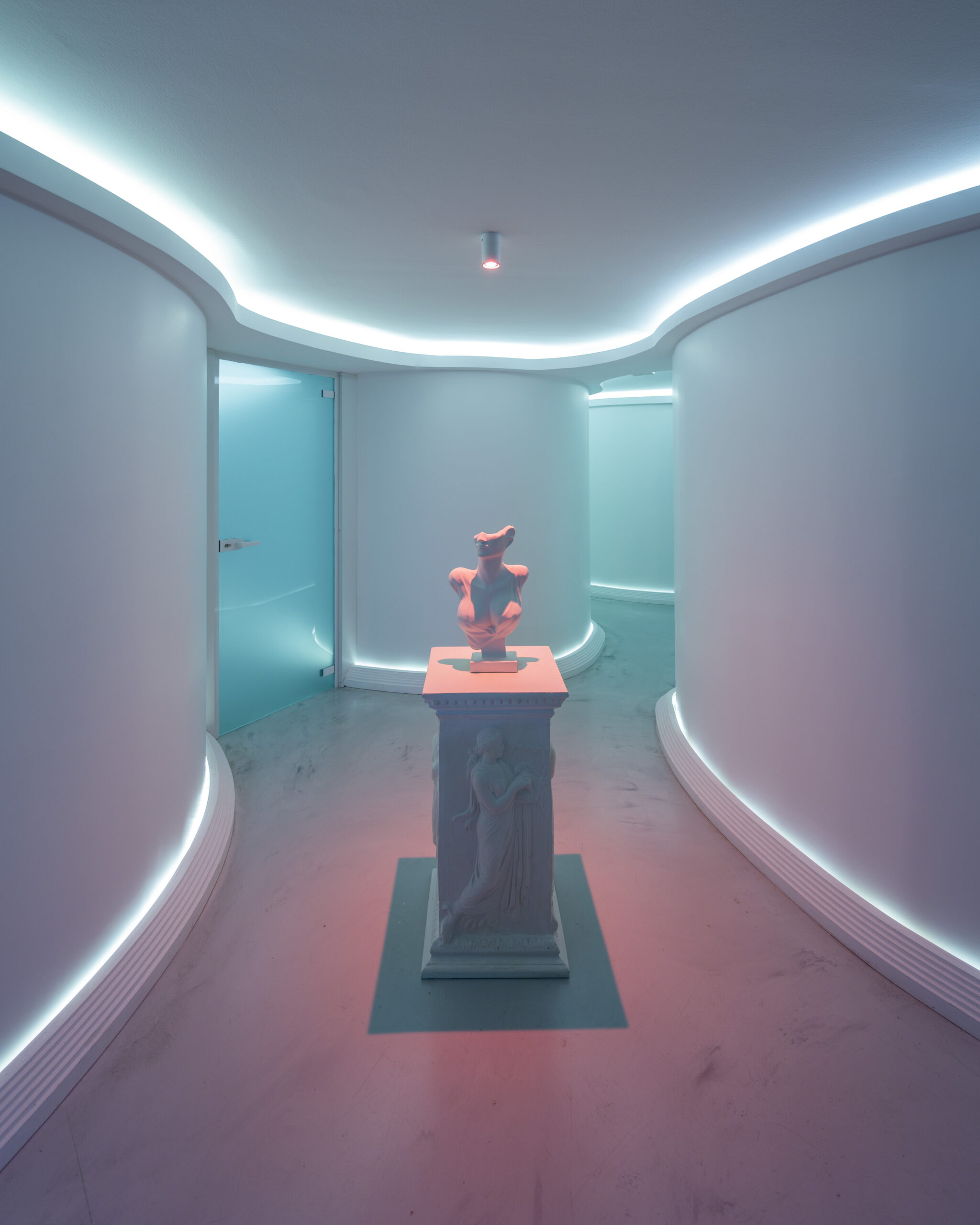 Geleneksel ofis tipolojisi ile kullanıcılarını karşılayan klinik, operasyon bölümüne doğru ilerlenirken mekanda kaybolma hissi yaratıyor. ‘Curve’ izlerinden yükselerek oluşturulan geçiş mekanı, operasyon bölümlerine dağıtımı sağlayan ana aksı oluşturuyor. Bölücüler üzerine giydirilmiş ikincil katman olan üçgen cidar ise gerekli aydınlatma vb. altyapı sistemlerinin klinik içerisinde gizlenerek dağıtılmasını sağlayarak mekanın sıra dışılığına katkıda bulunuyor. Gözün sabit perspektifini kıran operasyon bölümünde yer alan ana cerrahi müdahale odasına da buradan uzanan bir geçitle iletişim sağlanıyor.