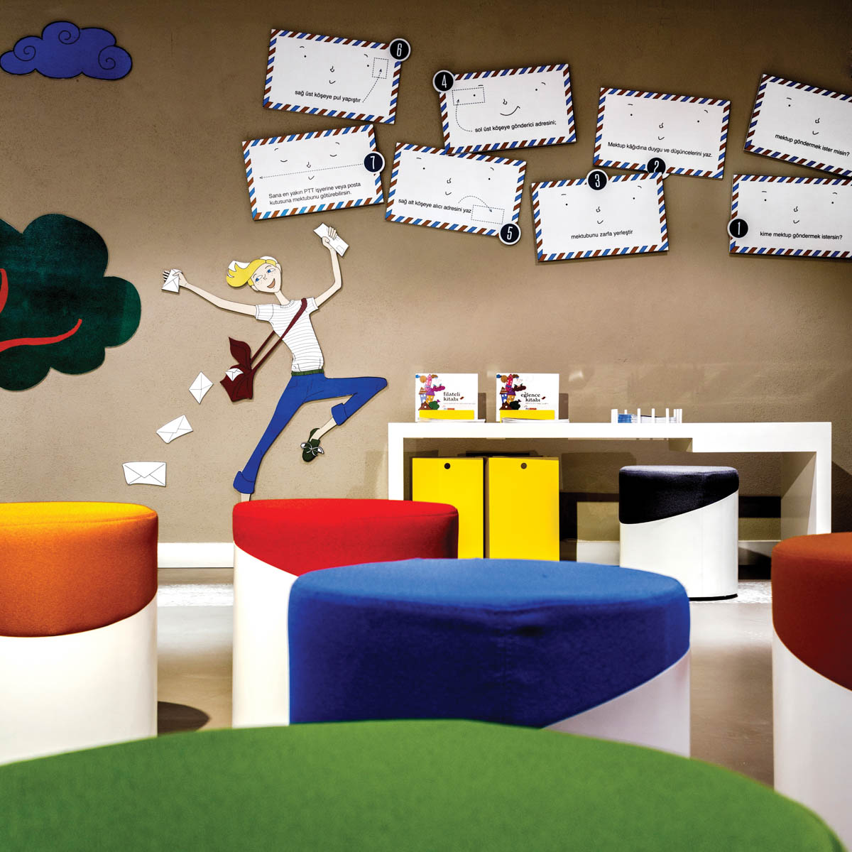 Müzenin bodrum katında “Çocuk Pulları Salonu”, “çok amaçlı salon”, “sergi salonu”, “müze atölye” ve “pul arşivi alanları” bulunuyor. Çocuk pulları salonu, müze kurgusunun oyunlaştırılmış simülasyonu gibi. Aradığınız tüm özet bilgilere ulaşabildiğiniz ama bir o kadar da rahat ve tanıdık hissettiğiniz bir alan. Bu durum illüstrasyon çizimlerinden, mobilya tasarımlarına kadar her noktada destekleniyor. Üst katlardaki bilginin iletilme biçimindeki ciddiyet aslında bir süre sonra yorucu hale gelebiliyorken, bu alan tam tersine saatlerce sizi içinde tutabiliyor.