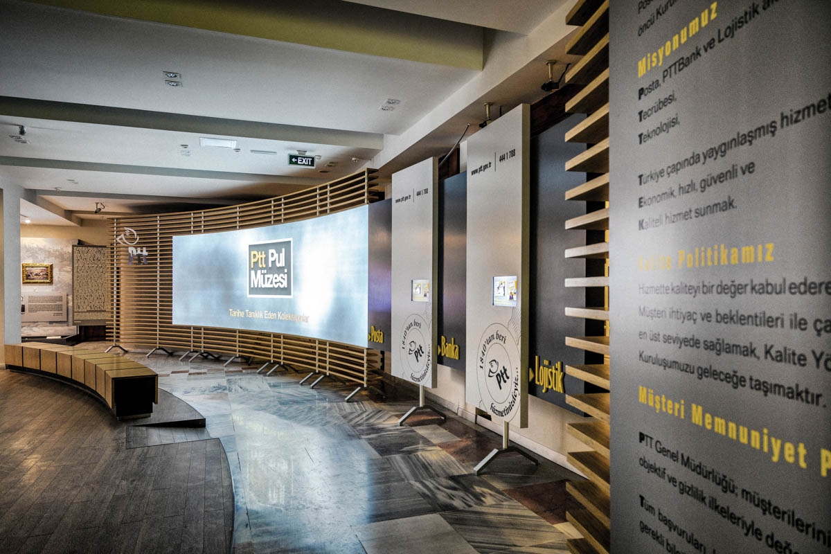 “Pul Kültürünün” sergilendiği alanda dijital bölmeler, grafiksel anlatımlar ve geleneksel gösterim biçimleri ustaca kurgulanıyor. Kullanılan grafikler ve dinamik sergileme biçimleri dikkati dağıtmadan, ziyaretçiyi iletmeye çalıştığı bilginin odağında tutuyor. Tasarım kendini belirli bir sırayla okutuyor. Önce iki boyutlu zemindeki grafikle iletişime giriyor, sonra sanki o grafiğin rölyef gibi zeminden kaldırılmış haline yönleniyor ve en sonunda da anlatımın üçüncü boyuttaki gösterimine ulaşıyor göz. Bu mantıksal geçiş zihinde konsantrasyonu sağlıyor ve zorlanmadan doğal bir biçimde anda kalınıyor. Bu durum doğru tipografi boyutları ve renkleri ile de destekleniyor. Dinamiklik mekanın her noktasında hissediliyor ancak tekrardan ve sıkıcılıktan uzak durulmuş olduğu için ziyaretçiyi her detayında yeniden kendine çekiyor.