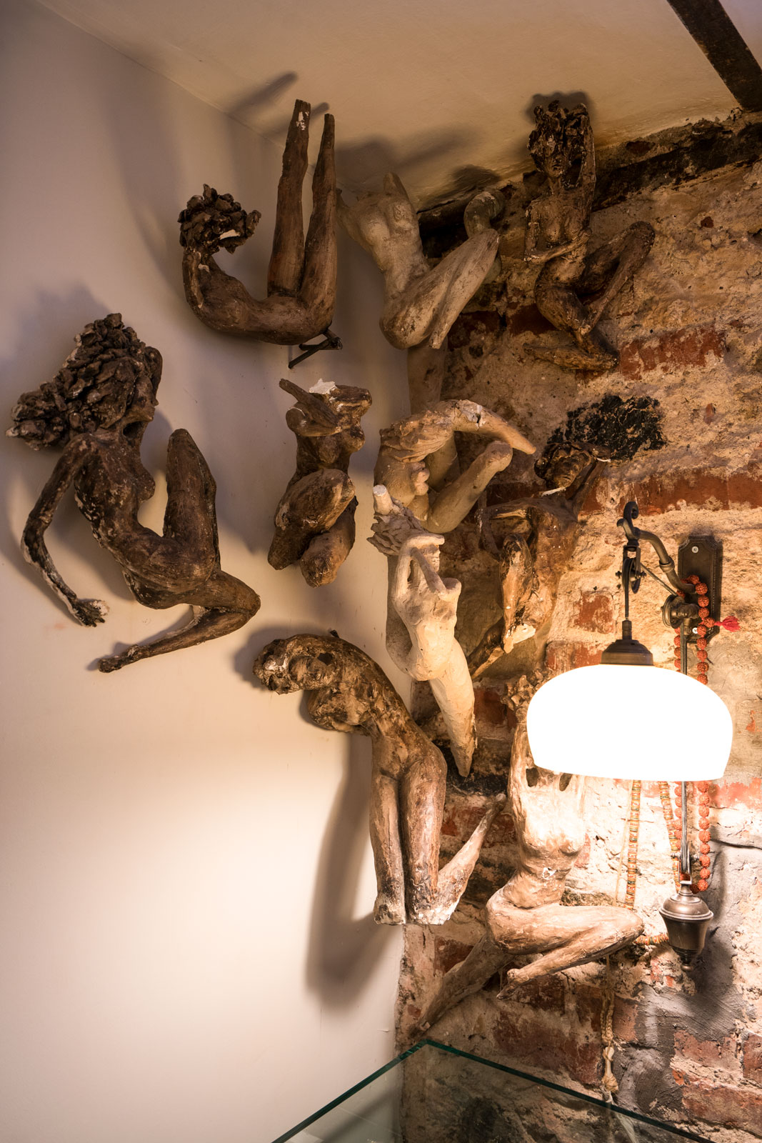 Evet annemle babamın ilk tanıştığı yıllarda babamın annemi çekmiş olduğu bir fotoğrafı heykele çevirdim. Babaannemden kalma bir bank ve ustamdan kalma takı tezgahım var. Aslında oradaki her objenin de ayrı bir hikayesi var. Hayran olduğum usta Avedis’e ait kendirden bir murç takımı, benim için değerli bir dost olan Süreyya Arıoba’dan özel parça kaya taşlar, kendi tasarımımla Victoria’n dönemi aplikleri bir nebze günümüze uyarladığım aydınlatmalar… Bu yer İstanbul’un ilk oteline ait bir at ambarıymış yani otel müşterilerinin atlarını park ettiği yer. Bu sebeple açtığım duvar sıvalarının içinden çıkan galvaniz kayalar da benim için değerli.