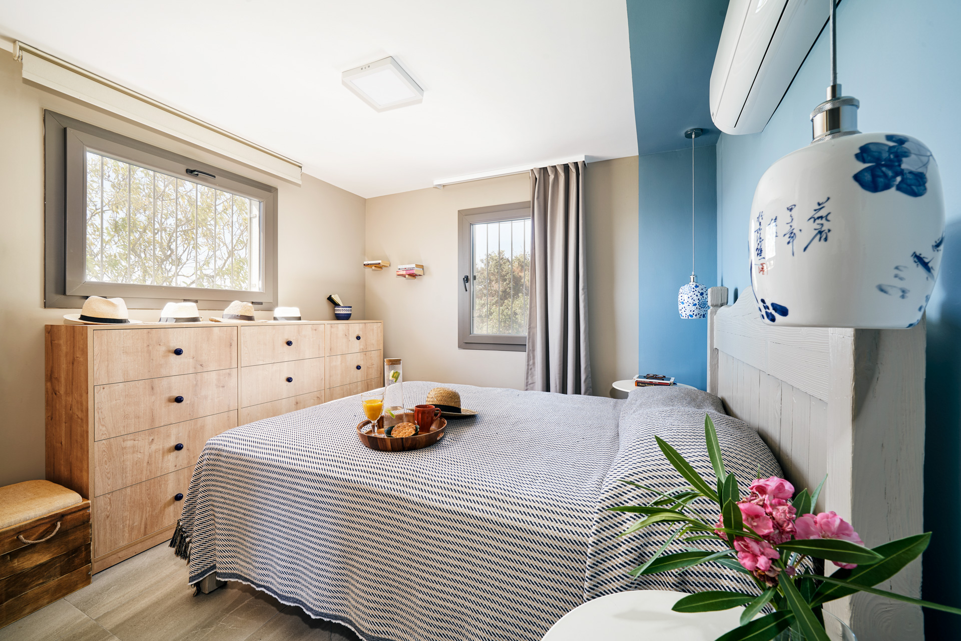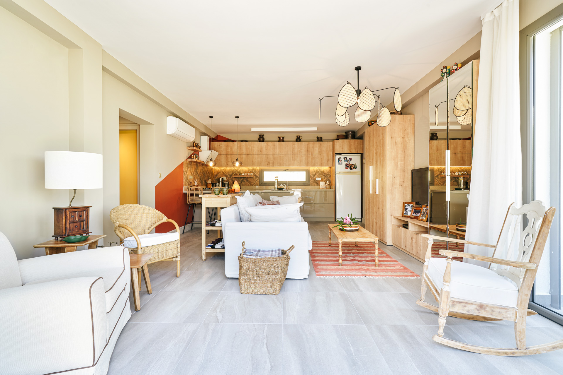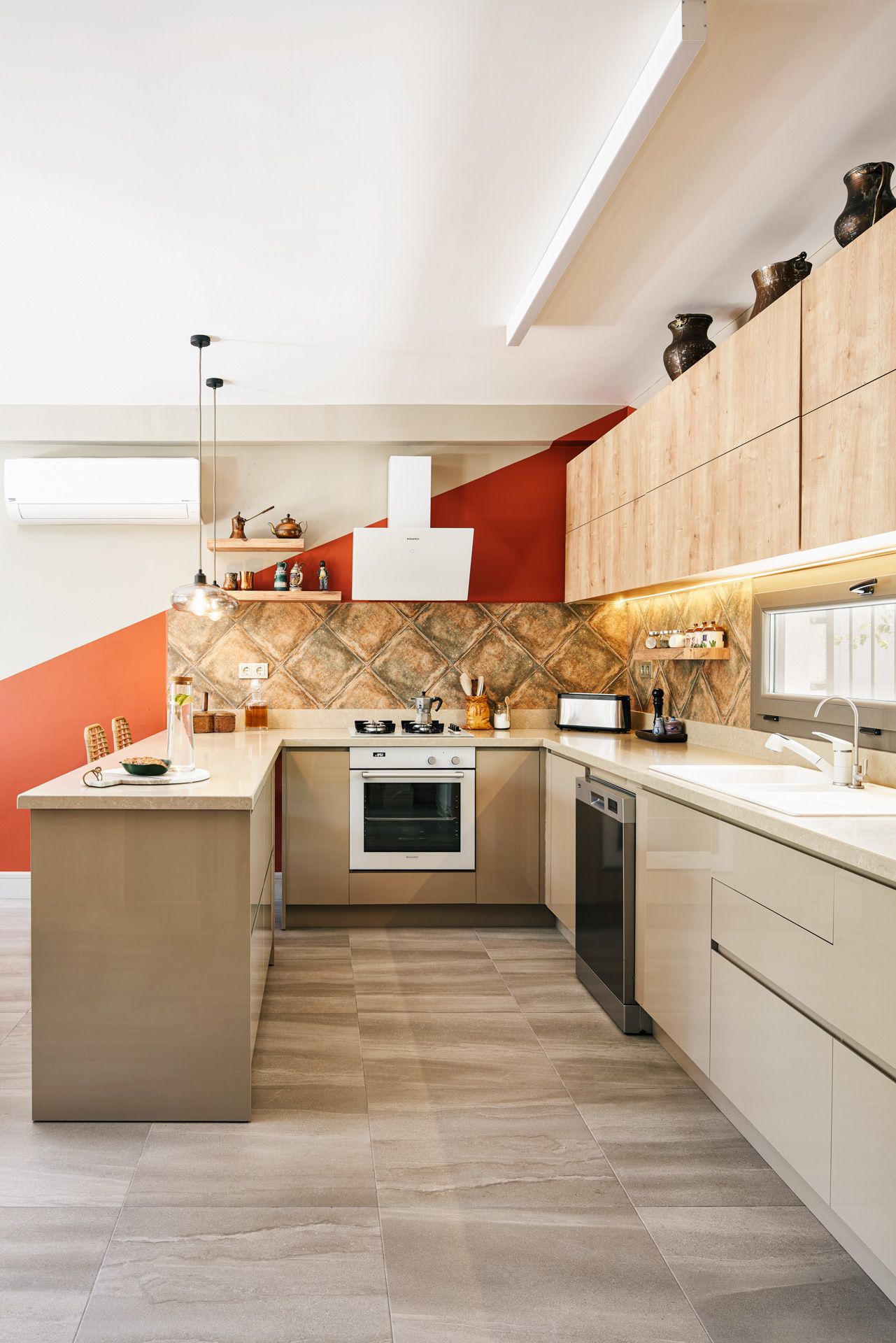 mevcut. 2 banyolu ebeveyn oda, 2 tane de ortak banyolu odası bulunuyor, toplamda 4 oda, 3 banyo, 1 açık mutfak, 1 salondan oluşuyor. Ev iki katlı, üst kat müstakil girişli ve kendine ait 50 m2 terasa sahip. Evi Kasım 2019 ortasında aldık, ilk Şubatta gelip ölçüleri alıp projelendirmeye başladım, 2020 Mart’a kadar kırım, söküm, kaba yapı işleri hızla ilerledi. İnce işlerine başlamayı hedeflediğimizde pandemi süreci başladı ve Mayıs 19’a kadar durduk. Sonra yine hızlı bir şekilde devam ederek Haziran 15’te taşındık.