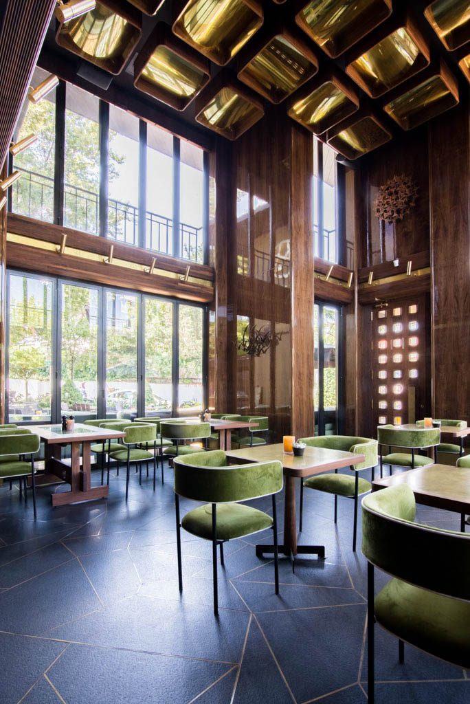 Girişten itibaren masadaki mermerden duvardaki kaplamalara kadar yeşili katlara yayan yepyeni bir mekan: Ajjna. Nispetiye Caddesi’ni bölen köşede açılan mekan; üç katlı binasında farklı kullanım amaçlarına hizmet ediyor. İlk bakışta sıcak ahşapları, yeşil yoğunluğu ve pirinç detayları ile dikkat çekse de detayına inildiğinde pek çok farklı unsuru bir arada barındırıyor. Mekanda Brezilya stilinden etkilendiğini dile getiren İç Mimar Esat Fişek, detayı bol bir projeye imza atmış.